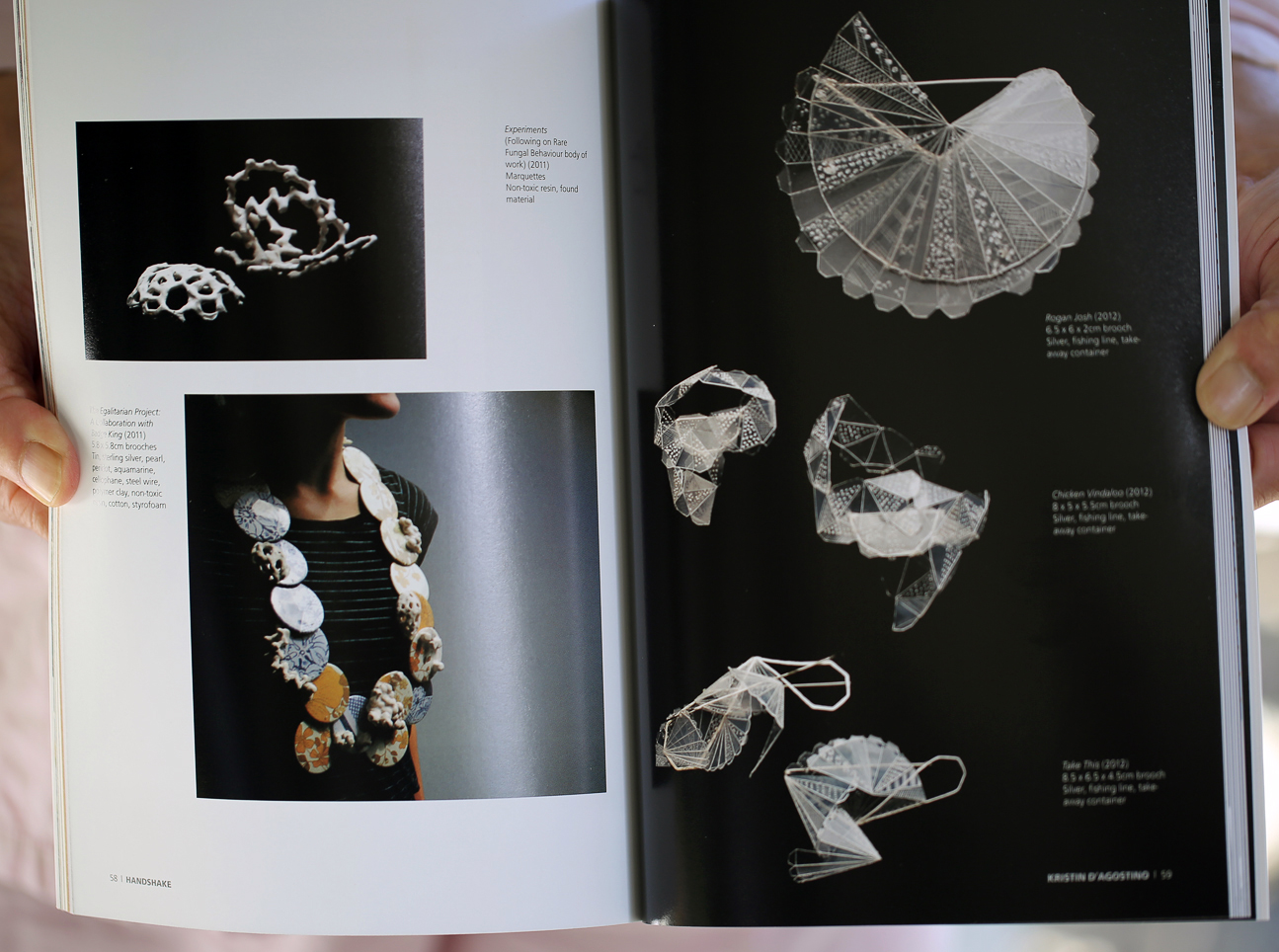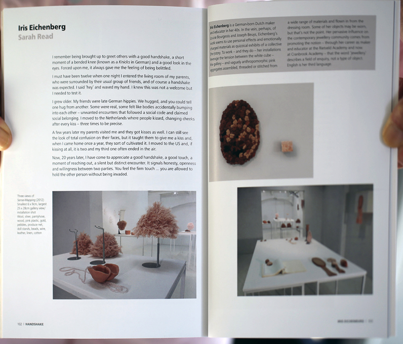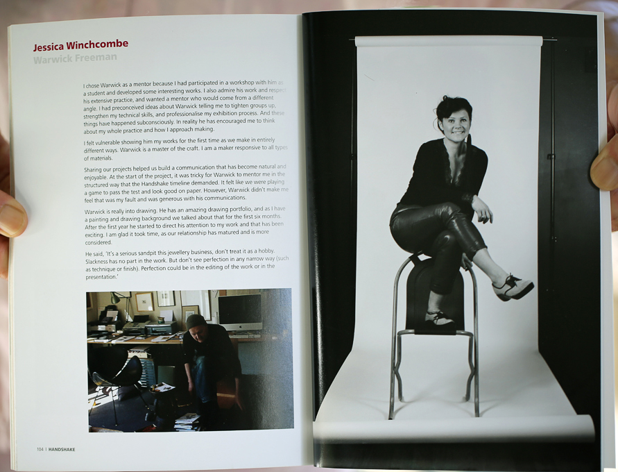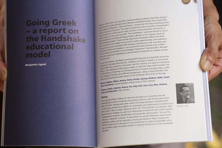 A substantial book called HANDSHAKE – 12 contemporary jewellers meet their hero is available from your local jewellery bookseller (eg Yellow Chrome bookshop, Charon Kranson, Fingers gallery). This 112-page book has a collection of mentees’ notes, as well as statements and work images from their two years’ apprenticeship. It features work and images from the mentees and mentors, essays from Benjamin Lignel (biographies of the 12 mentors plus an essay), Mary-Jane Duffy (mentee and mentor questionnaire texts), Raewyn Walsh (essay about historical connections to learning processes and systems in NZ context), Andrea Wagner (mentor reception introduction text), Sharon Fitness (mentee reception text), with an introduction to the project and essays by Heather Galbraith, Dean of Massey University, Wellington, NZ.