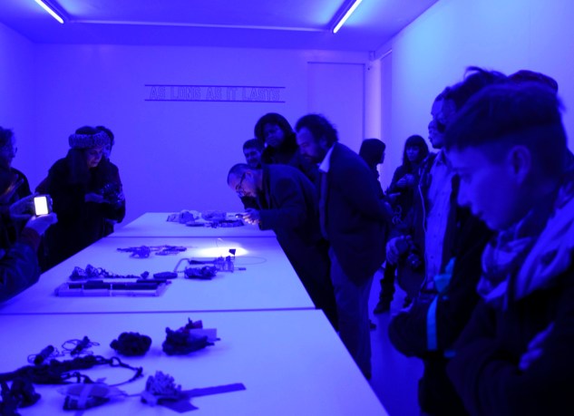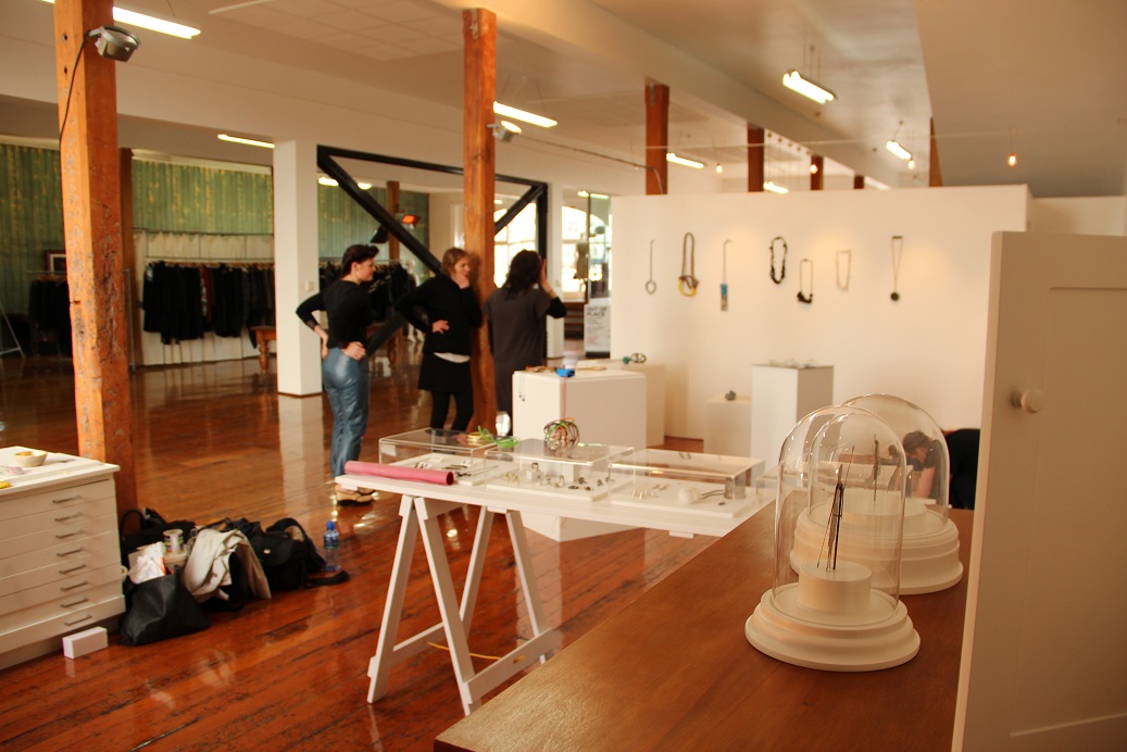 Setting up for Handshake was an epic task and I take my hat off to Sharon and Peter who started a whole day earlier than the rest of us. In typical New Zealand sprit we created an installation using duc tape. The display was modeled on the layout of a subway map (using the tape to map the coloured strands of the tracks) and aimed to present the development aspect of Handshake as an ongoing project. Each person had their own ‘Platform’ displaying jewellery, surrounded by images to document their journey.