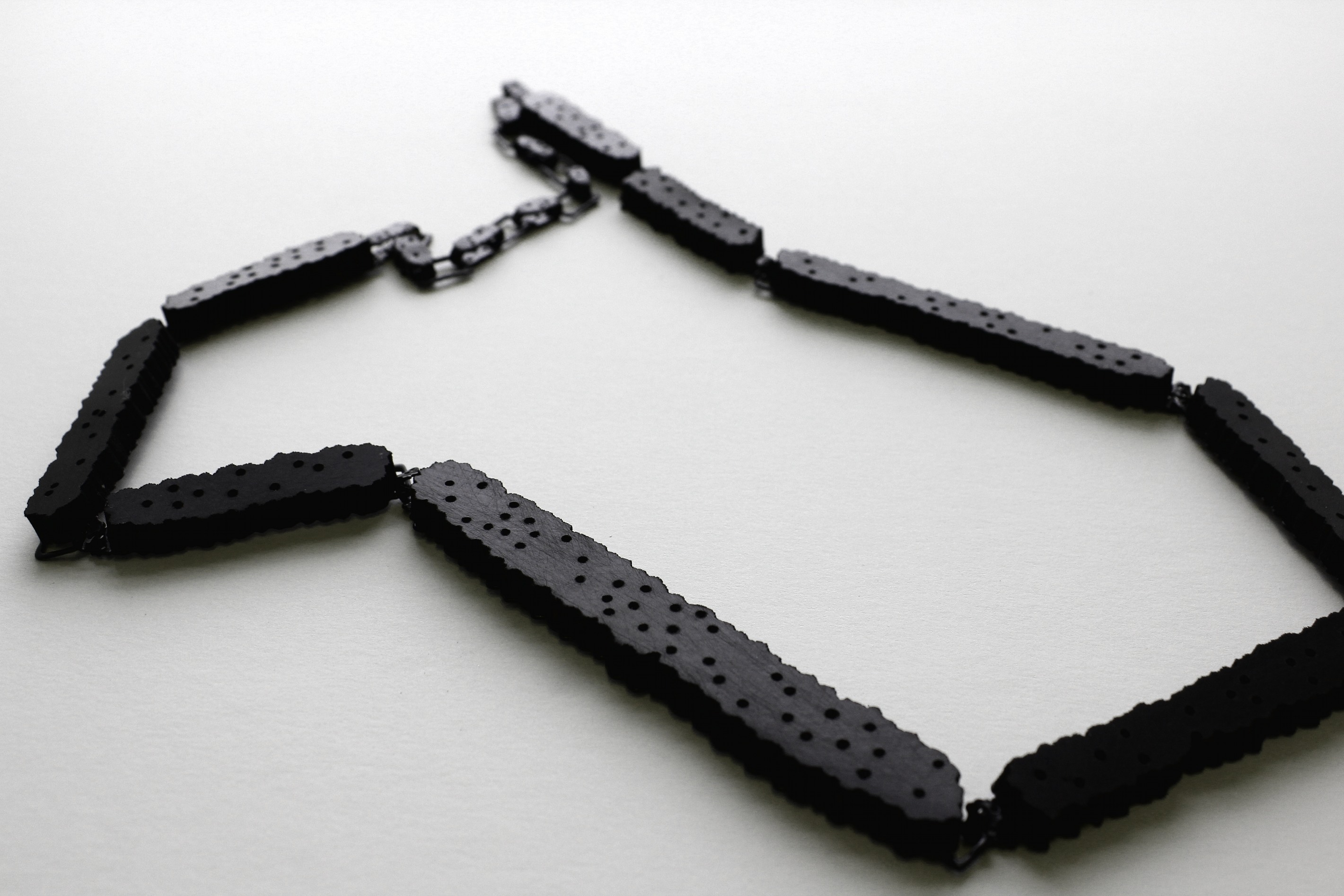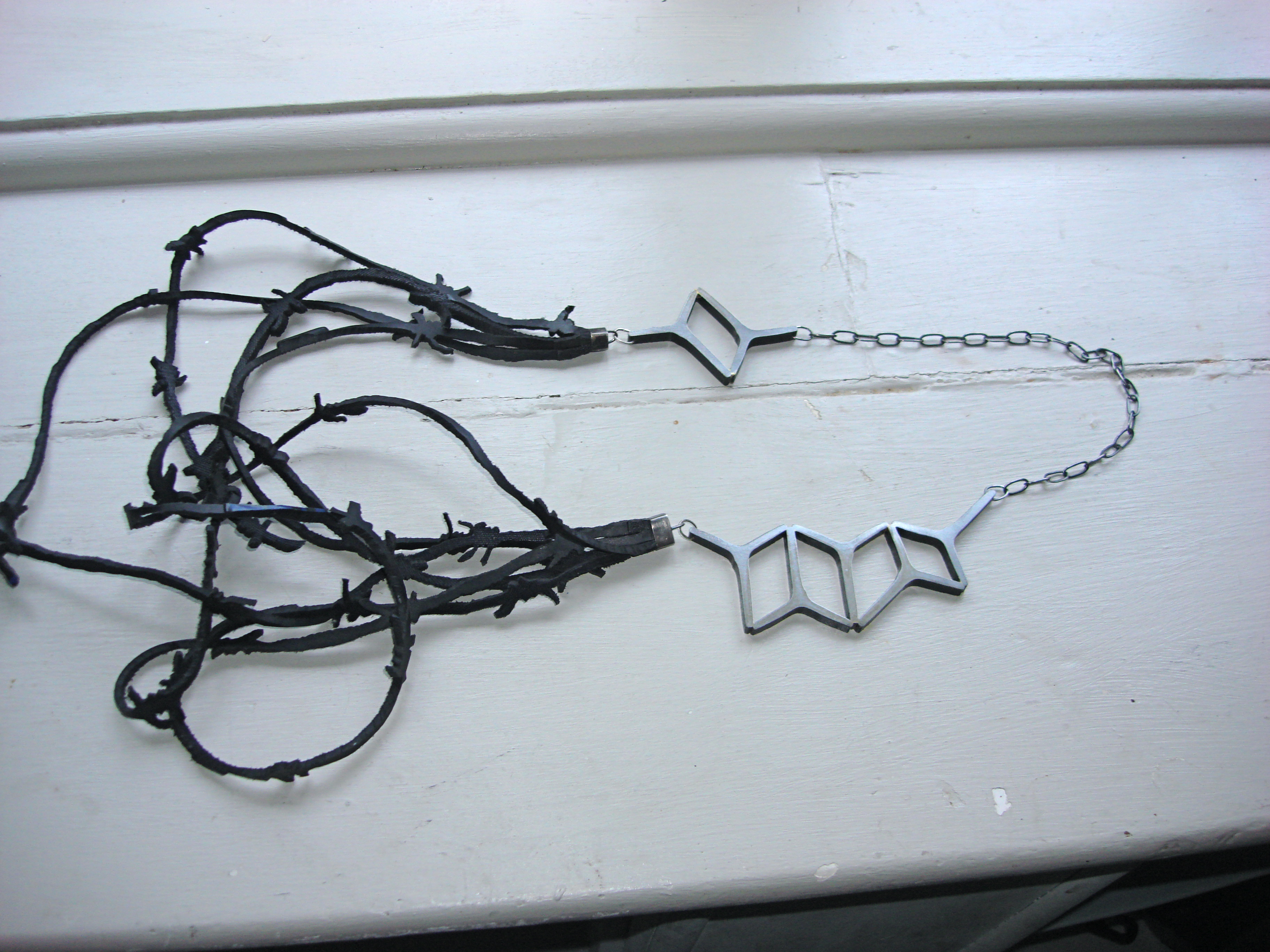 Debbie Adamson. Necklace: Meet me in the middle. 2010. Gumboot rubber, Sliced steel fence posts, sterling silver.