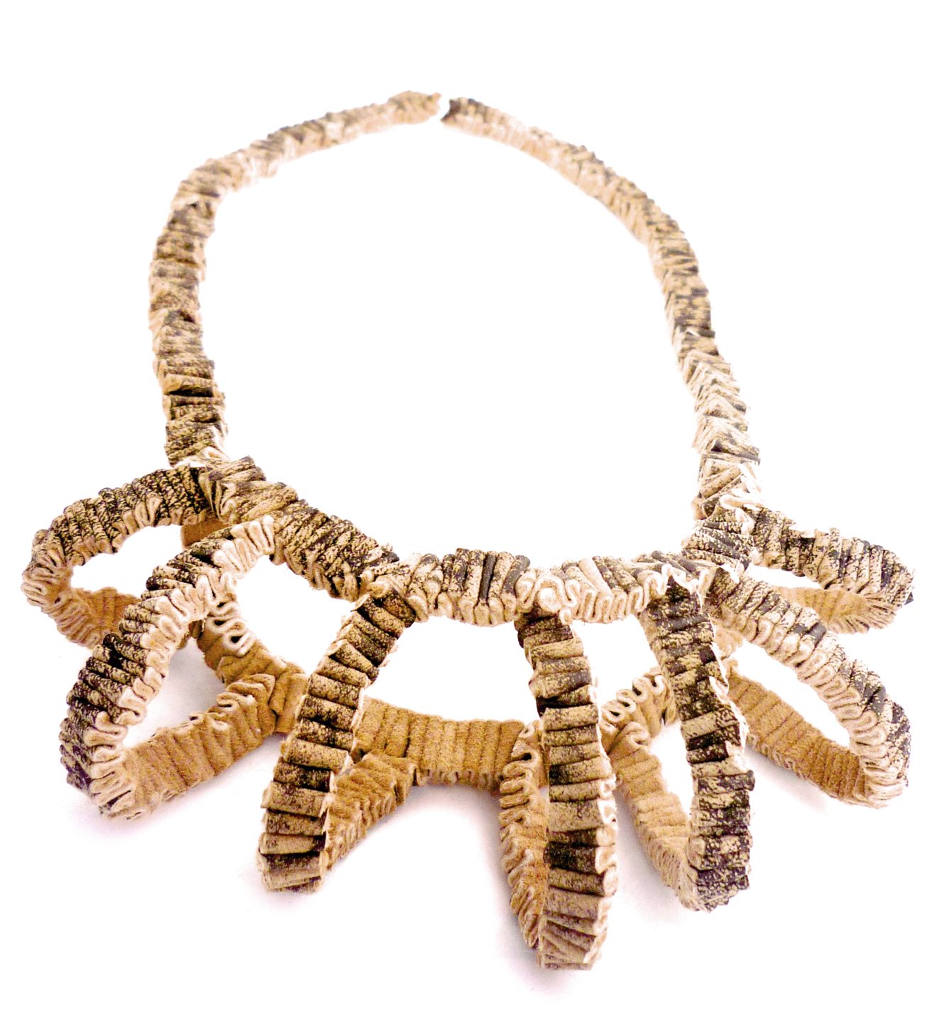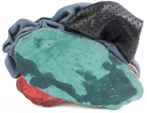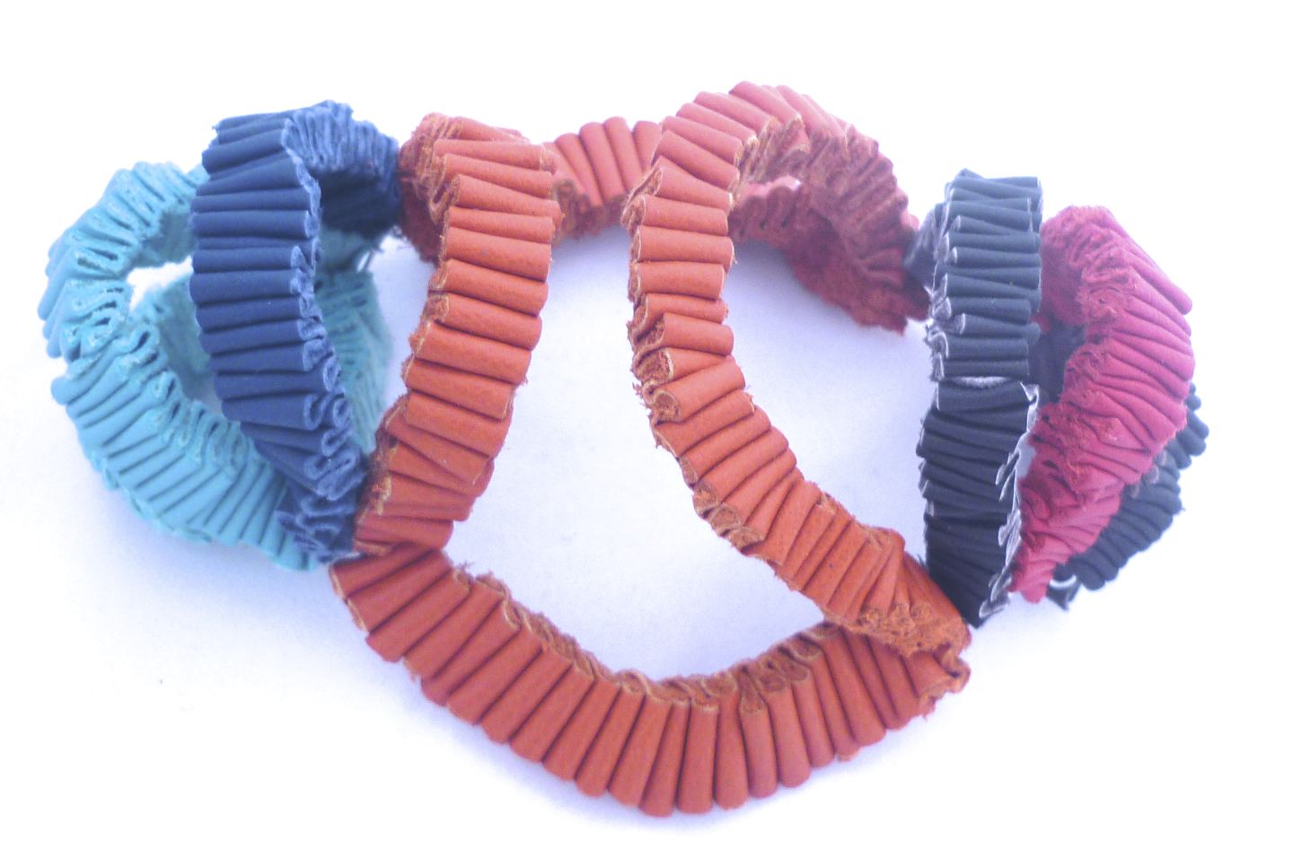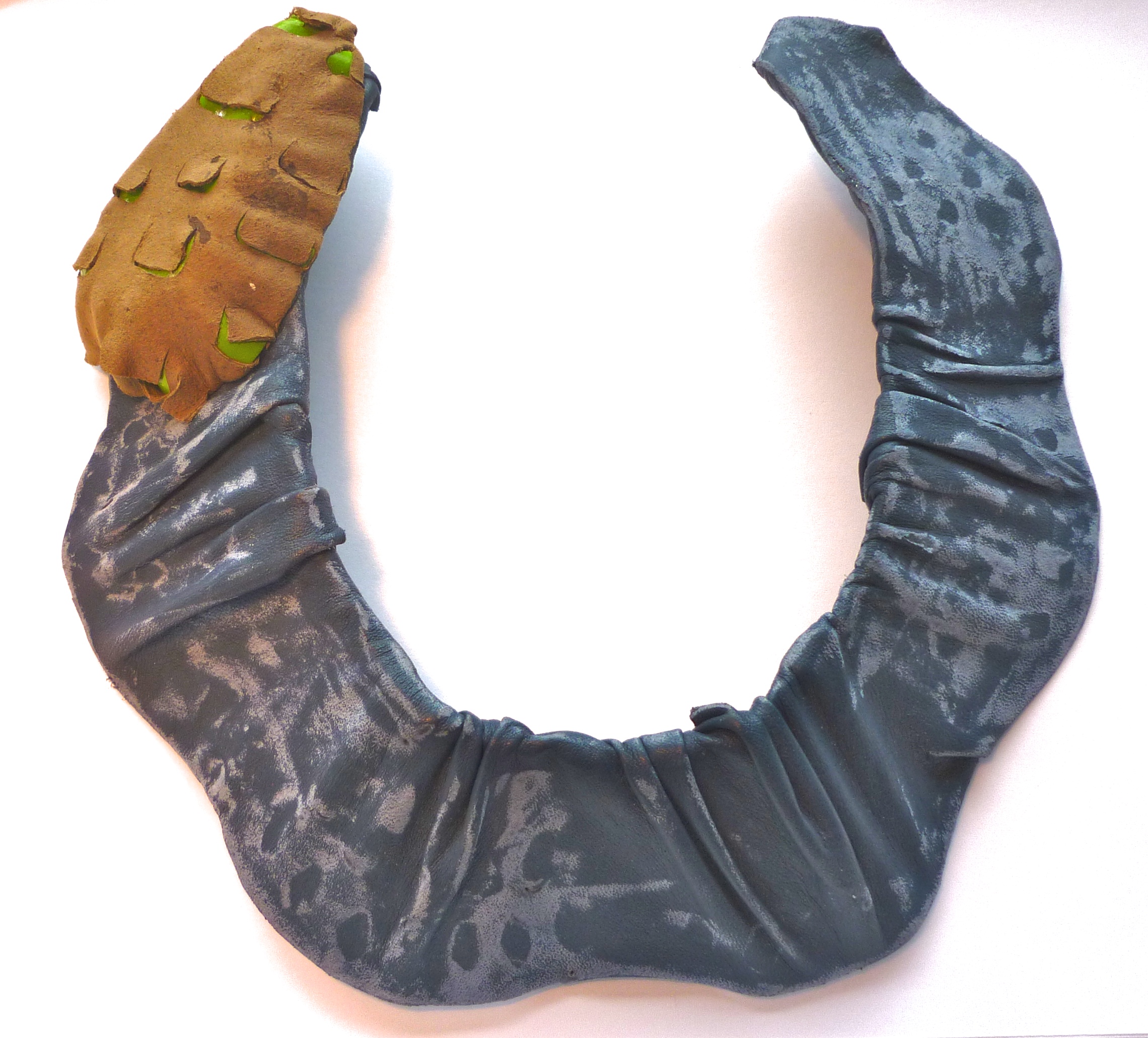 Stacks and folds object/ Necklace Blue and brown Dyed Leather, plastic, copper