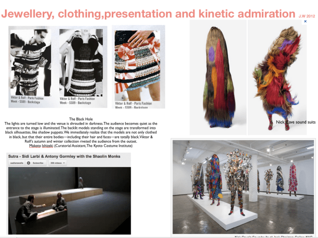 One thought I had is how you engage with fashion, and how the relationship that Contemp.Jewellery has with fashion is a fraught one. The usual role jewellery plays in fashion is as accessory and that’s not one CJ likes – preferring instead the role of jewellery as art object (to be worn or not). Unlike a lot of CJ artists I position my work along a line closer to accessory that most of them would be comfortable with. I don’t engage directly with fashion but I do acknowledge and enjoy how my work is used in that relationship. What I mean is the reading of the work purely as art object is potentially very misleading. A work can look dead as an object but come alive when being worn and engaging with costume and character. Its not an excuse to give your work less attention though and your ambition to give a work more ‘consideration’ is a good instinct to follow. Good luck. W.