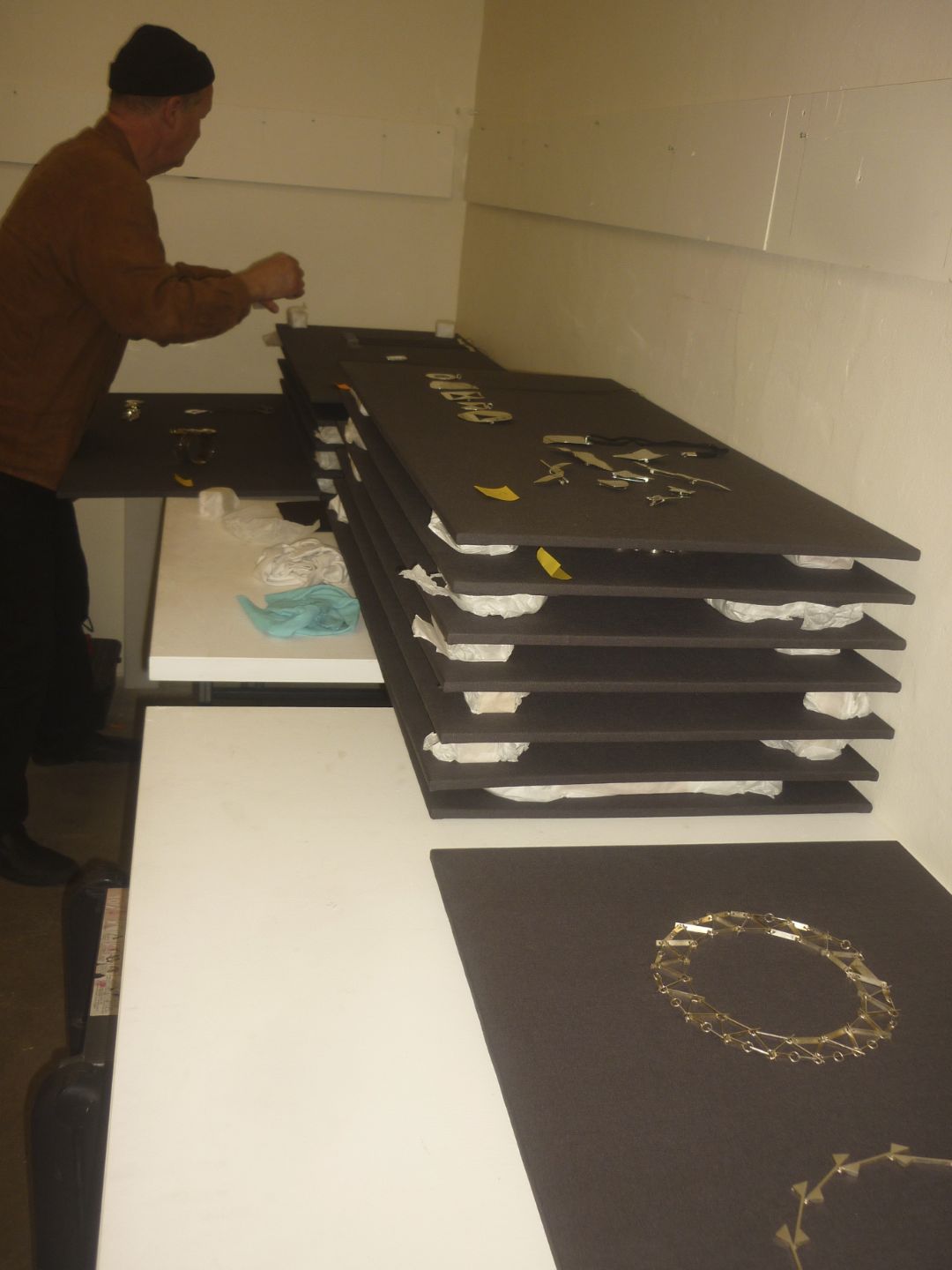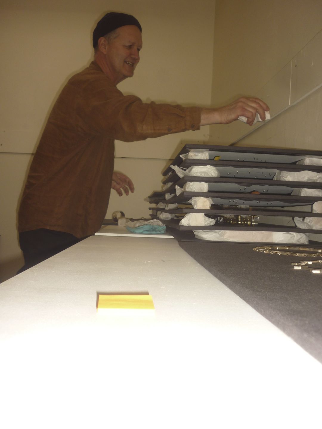 Below:Warwick considering the lay out of Kobi’s retrospective works to be held at Object space. Each piece was laid out and considered before delicately sewn onto boards. It looks like quite an amazing exhibition with works being lent from far and wide, from personal collections and such places as Te papa.