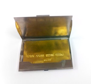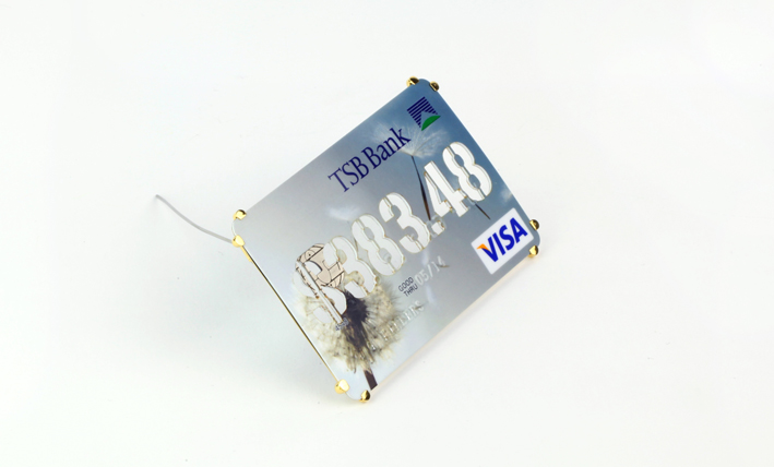 Credit card, 24 ct gold plated bronze, steel, visa statement, frame, acrylic, brass