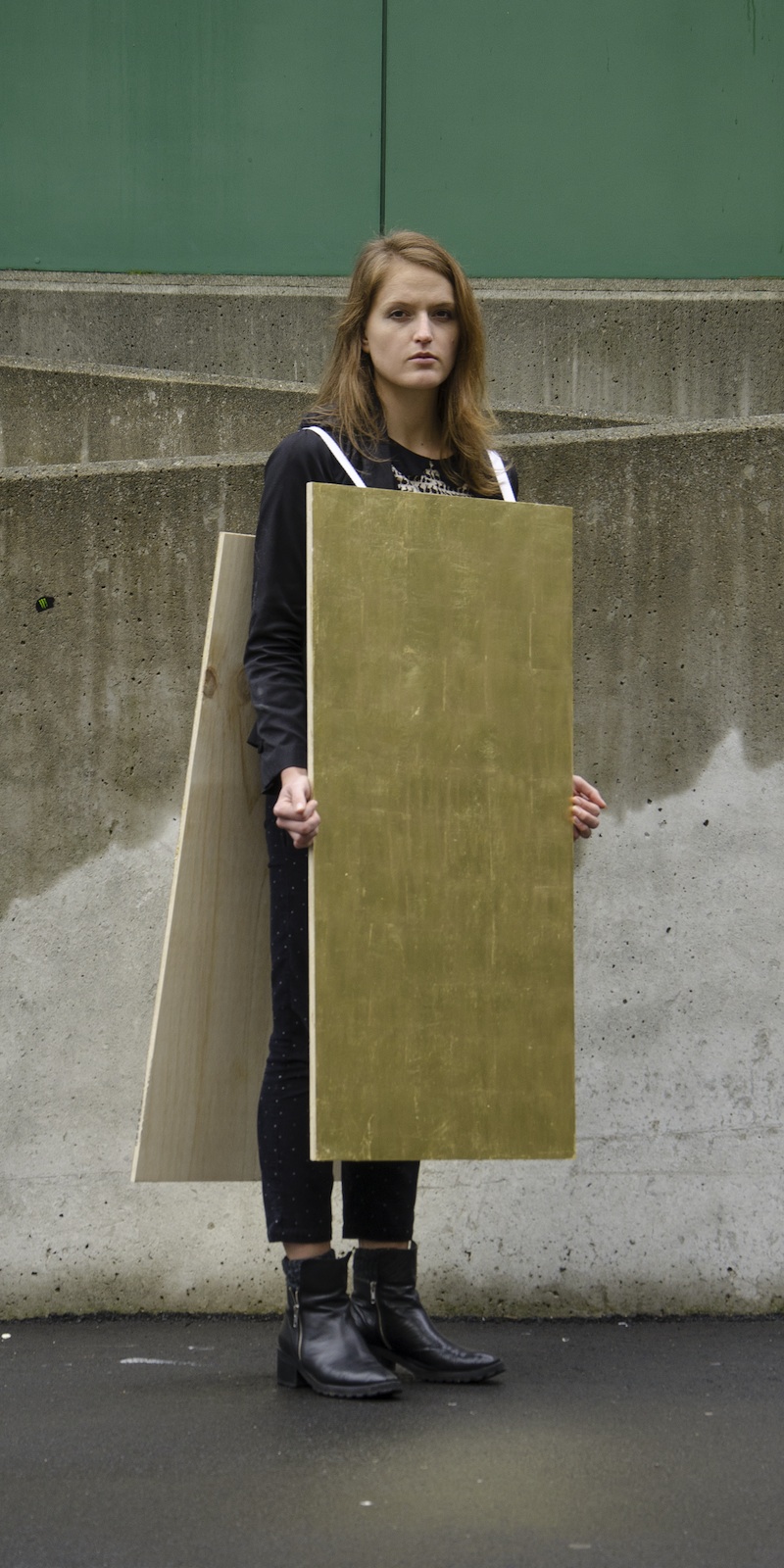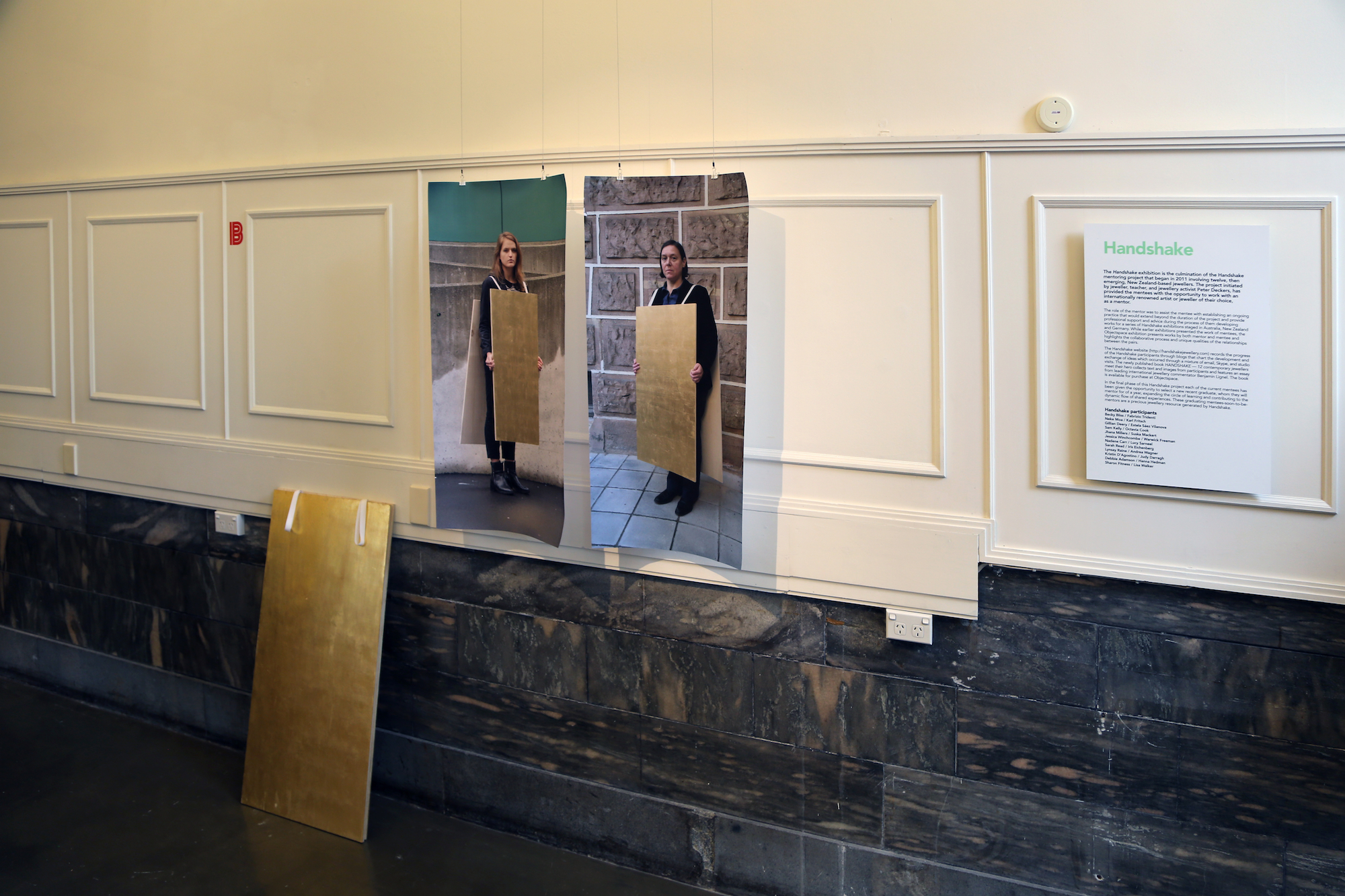 Display, Digital photographs, Sandwich board (plywood, 23ct gold leaf).