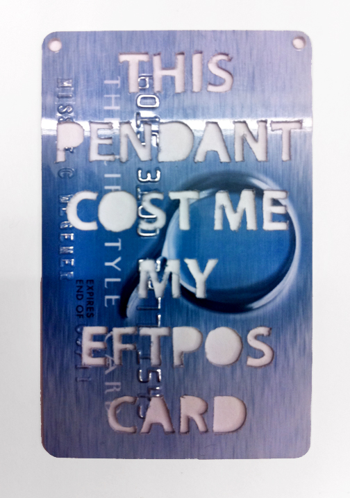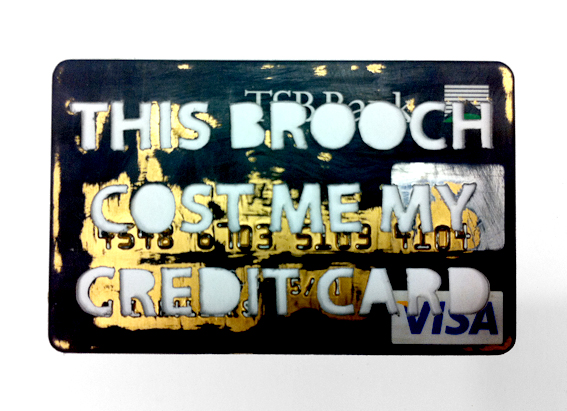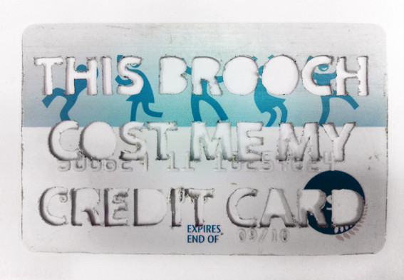 New tests, interventions, not quite sure what works the best yet. But, thinking that the piece can only take shape once the customer/exchanger hands over their credit card with their debt balance. This debt balance is then cut out of their card and potentially made into a wearable item. Whether a brooch or a pendant, materials for the finding/backing would be gold plated bronze.