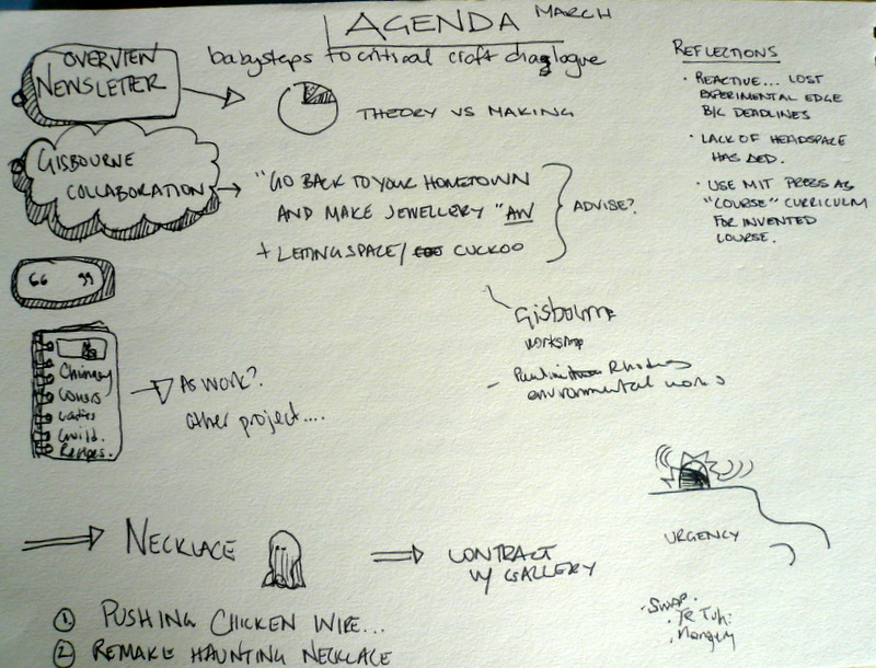 Judy and I have discussed the balance between organising and making in previous meetings. It is a hard one. I feel like I am tipping off course with too much administration. My making time is limited and at the moment, I seem to fill that precious little time with jewellery related, non-making jobs. I love all of the things I do, but think some re-evaluation needs to take place. At the moment, I have just finished a piece for a fundraising auction, I am co-planning & co-running a day-long jewellery workshop in Helensville, am co-editing the jewellery newsletter the overview and am busy with the third iteration of Broach of the Month Club. I should probably only be doing one or two of these four things.