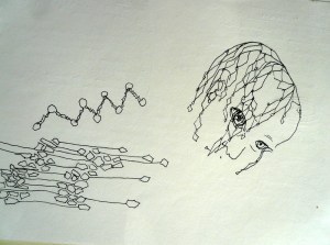 Judy also suggested that I draw more and I have been really enjoying that lately. I love drawing with my wrong hand. I read a book a long while back, kept a wrong-handed self-portrait journal for a year and have never been the same. I have repeatedly explored the relationship between drawings and 3d objects without much love. The output is too literal or does not capture the essence. Then I saw….