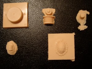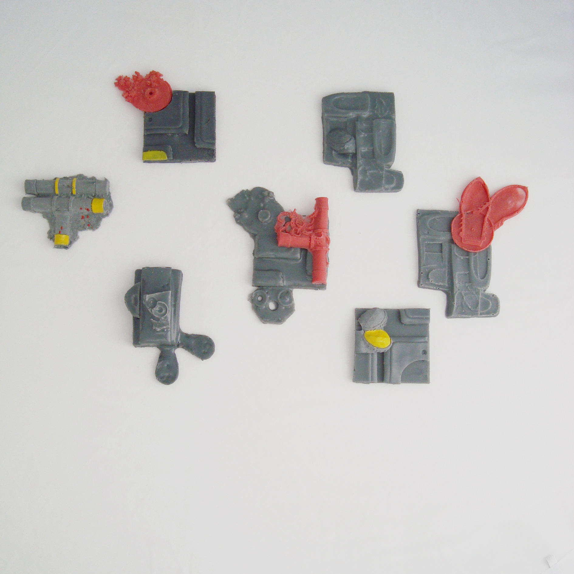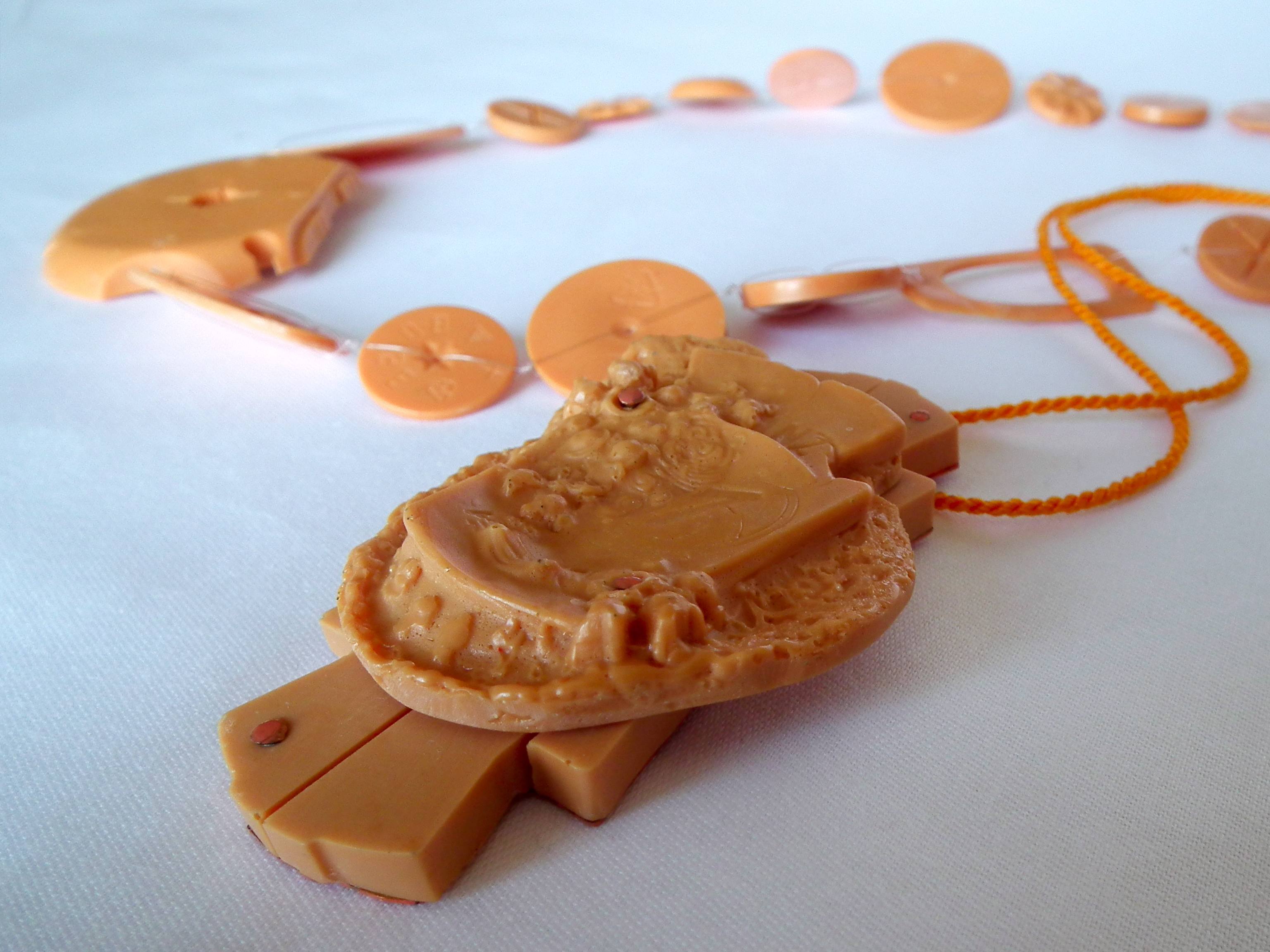 Using different moulds with the same casting material makes it possible to easily mix, join-match the most different object shapes since the eye sees the material as unifying message while the shapes blend in as extra message. You don’t end up having quite the same issue of things not ‘fitting’ because of WHAT they are (plate to chair leg, costume jewelry fastened to rubber tree; while the same objects as shapes in the same material would do something different with your perception… not that these examples would make good pieces! but you might catch my point).