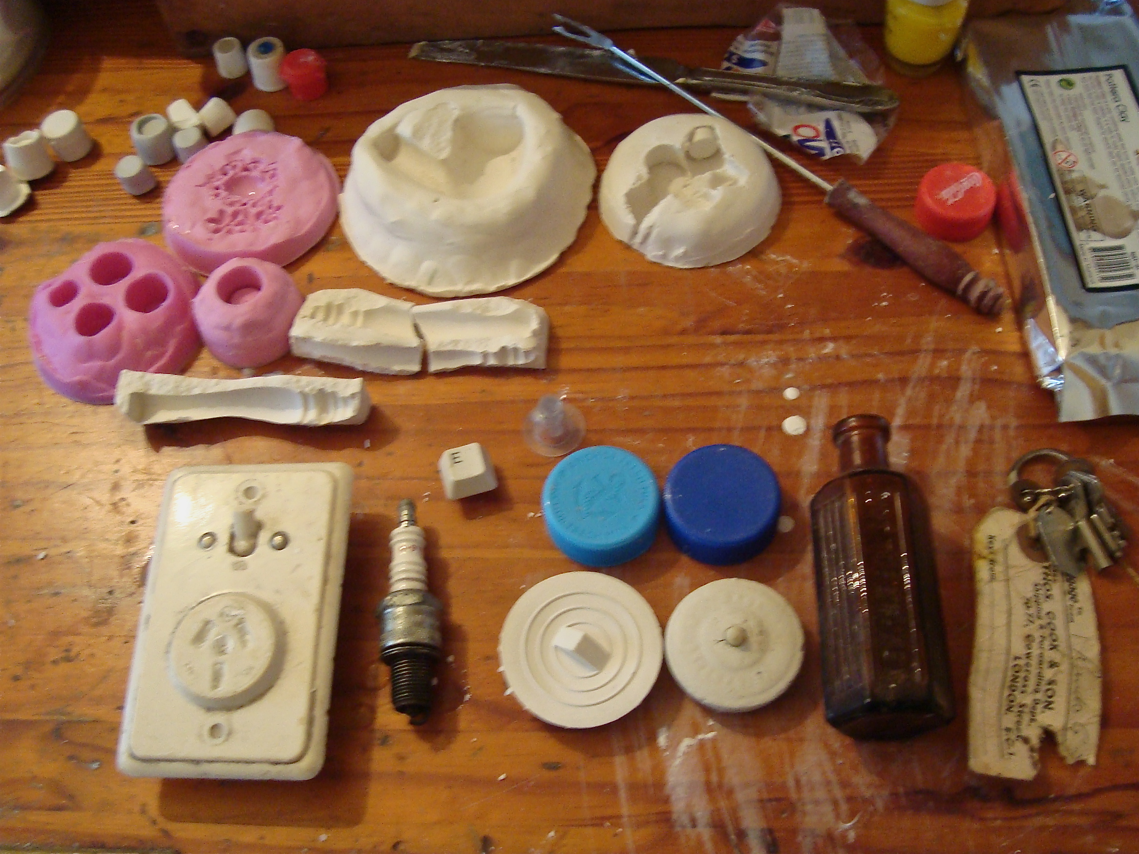 I have been thinking about the idea of showing the process, showing an event has happened, showing the traces- perhaps beginning with creating impressions, playing with the mass produced objects, bottle tops etc. I collect, making impressions, show the join lines. I have been thinking about artists Rachel Whiteread and Allan McCollum. Whilst studying I used clay to make impressions of features of the school building which used to be a mental asylum. I have been thinking back to this project and how I could use it in my current environment as a way of collecting information about my surroundings.