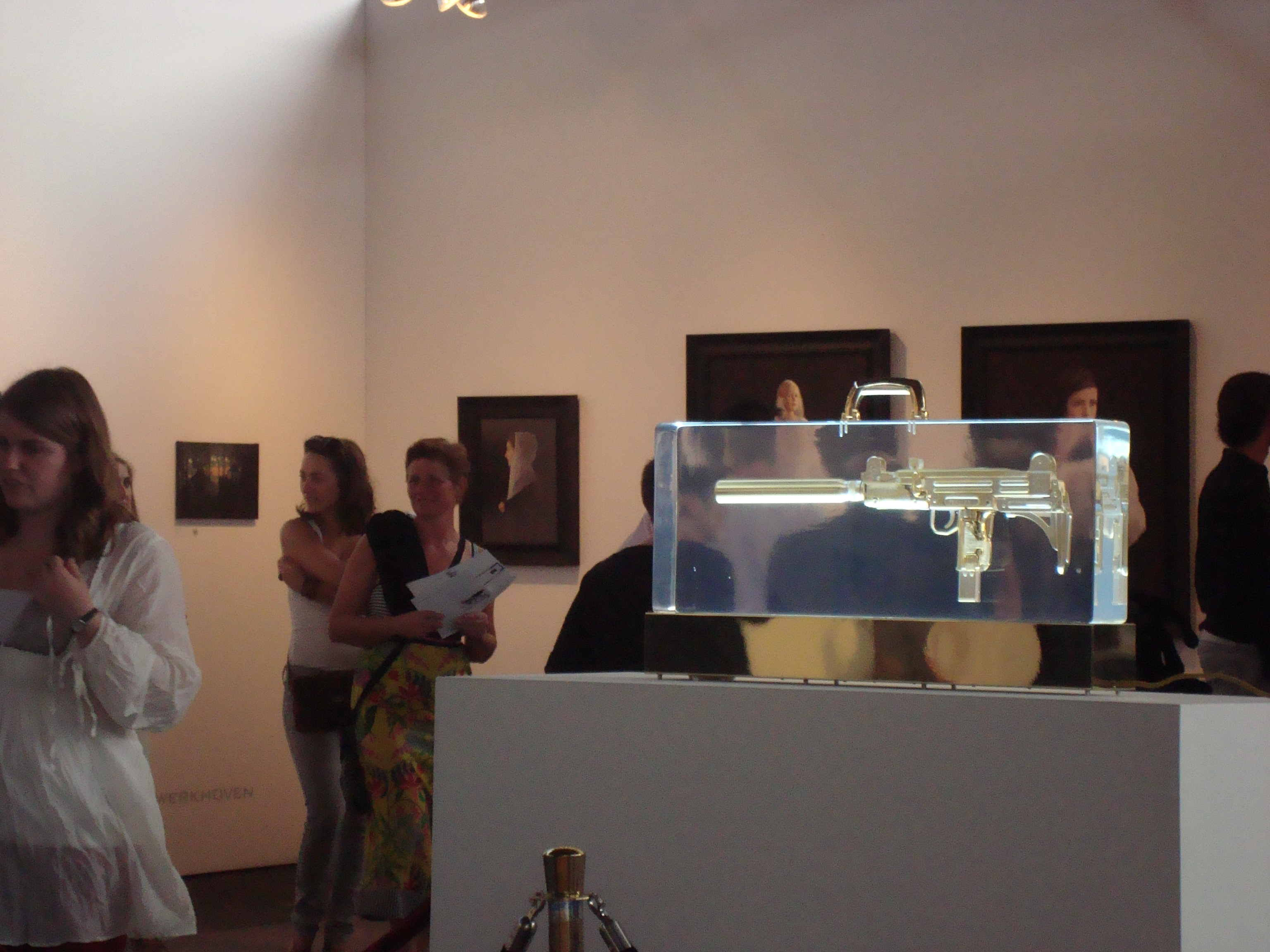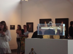 On the Sunday I went with Andrea to visit one of the two exhibtions where Andrea was showing work during Scmuck. We visited the ‘What’s in Frame?’ exhibition at Three Stations, a group show next to a cluster of two other shows. The exhibition was in a studio and had a quite a variation of work, this was Andrea’s contribution titled “Diamonds are a Girls Best Friends” within a frame that still had the title of its original painting “Saturday Evening” stenciled onto it.