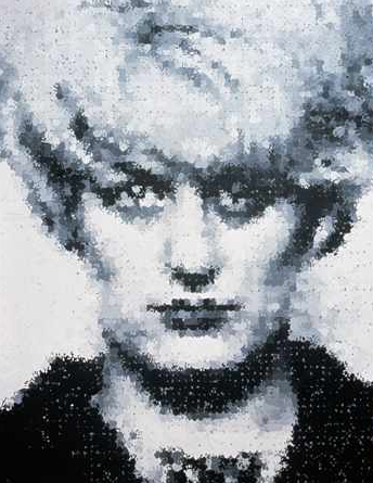 – Marcus Harvey’s painting of Myra Hindley, and English woman who murdered 15 children in the Moors of England. The painting is made up of children’s handprints to look like a painting of her face.