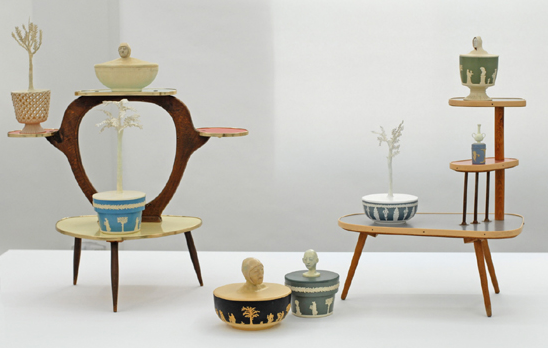 In each piece, decorative and functional forms are assembled into compositions. Casting processes allow me to create a series of replications, constructed to create ambiguous readings. Old inherited costume jewellery looses its lustrous sparkle as it is duplicated over domestic objects.