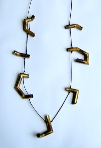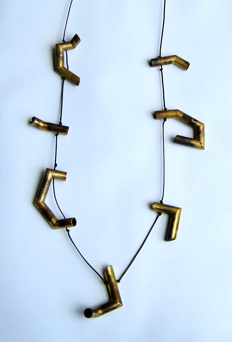 I have learnt a lot about making my recent collection. The first stage of casting forms to get shapes I was happy with took time, then there was alot of experimenting with colour, composition and finally construction. I have started incorporating painted metal to add variation in colour tone in piece and give a stronger structure to each piece. I am still liking the lightness of using nylon to thread but think there is a wee way to go in getting the balance between the threading and the brass tubing and cord. I think I have found the construction the most challenging in this series.