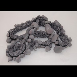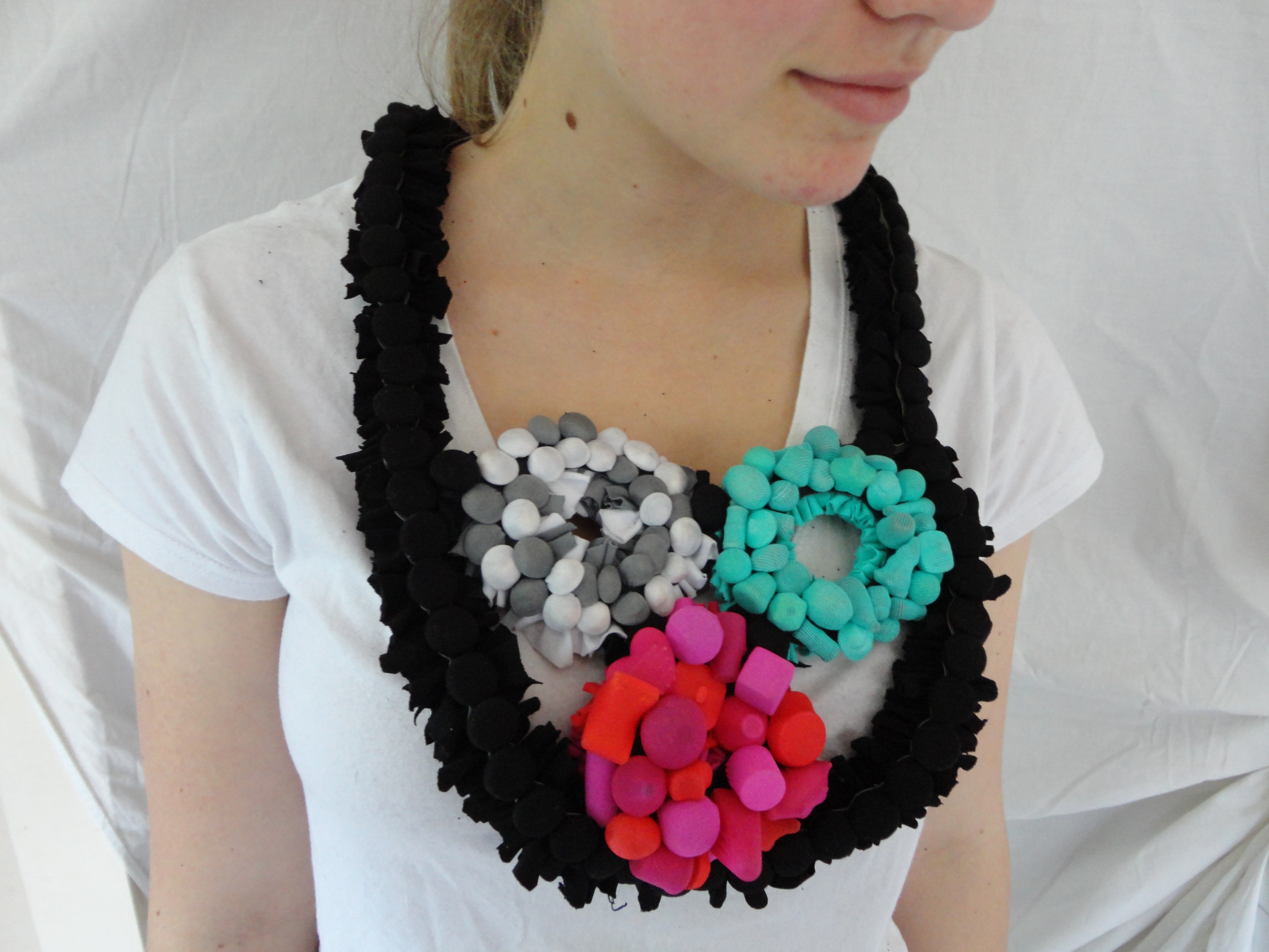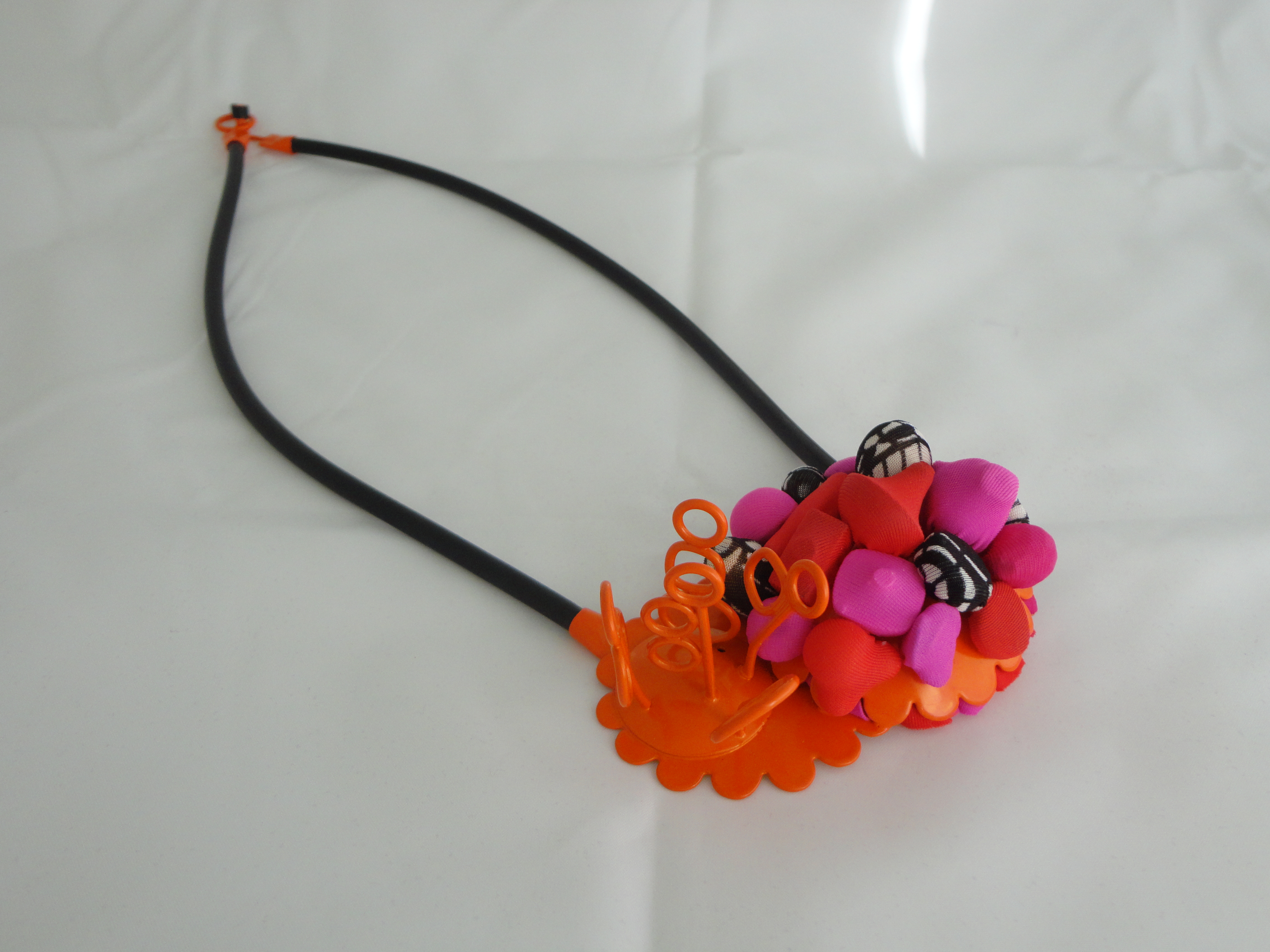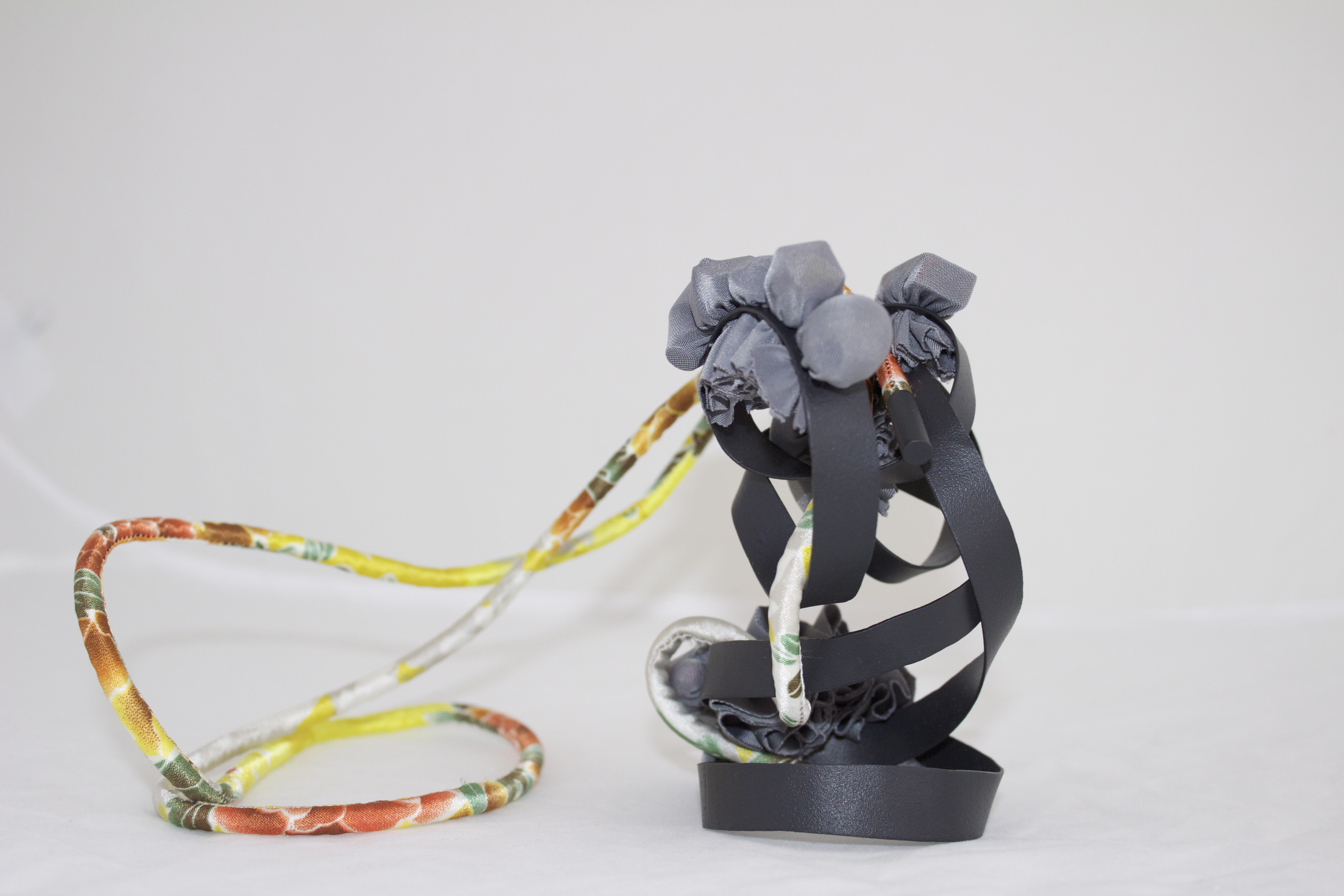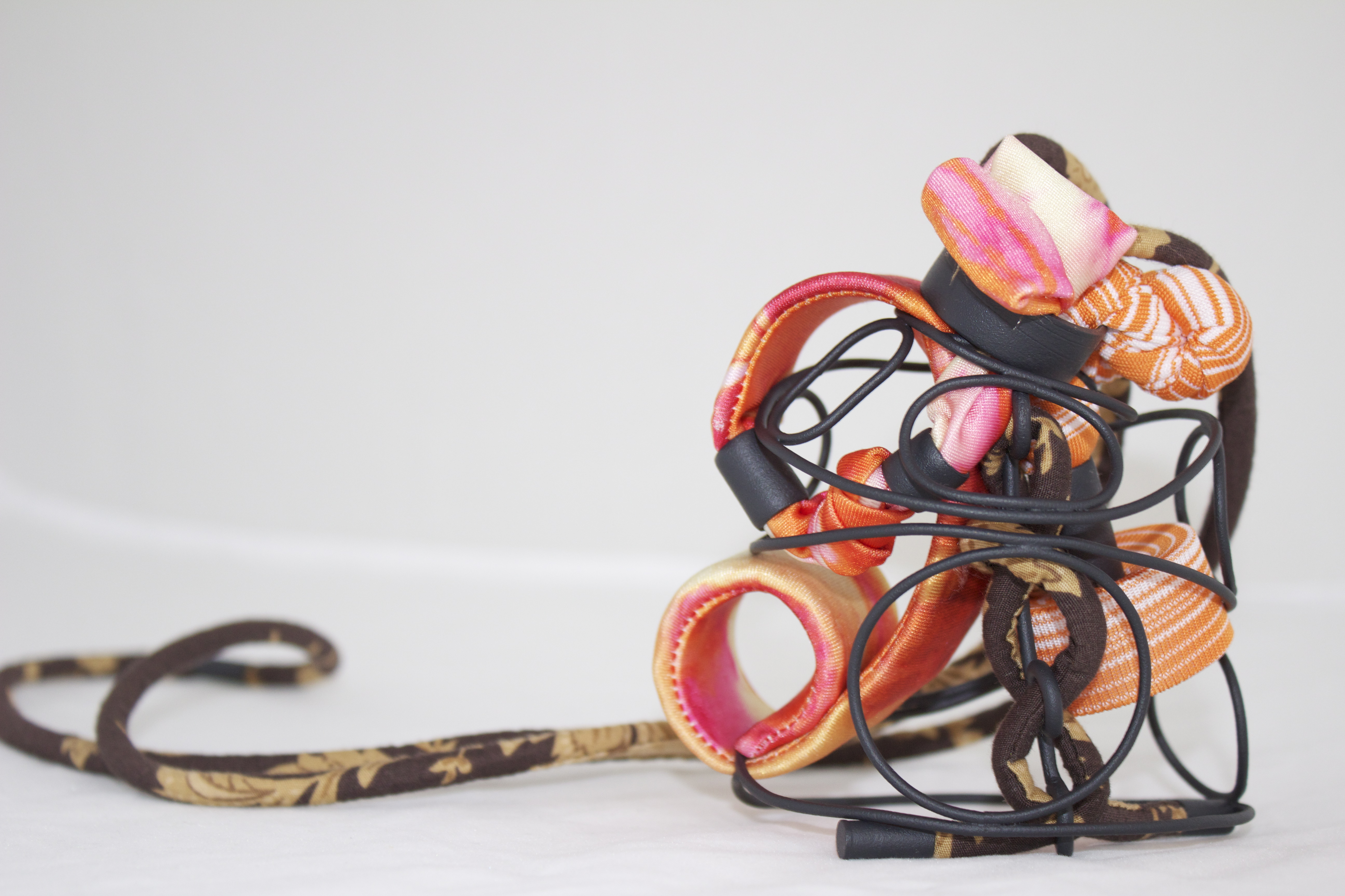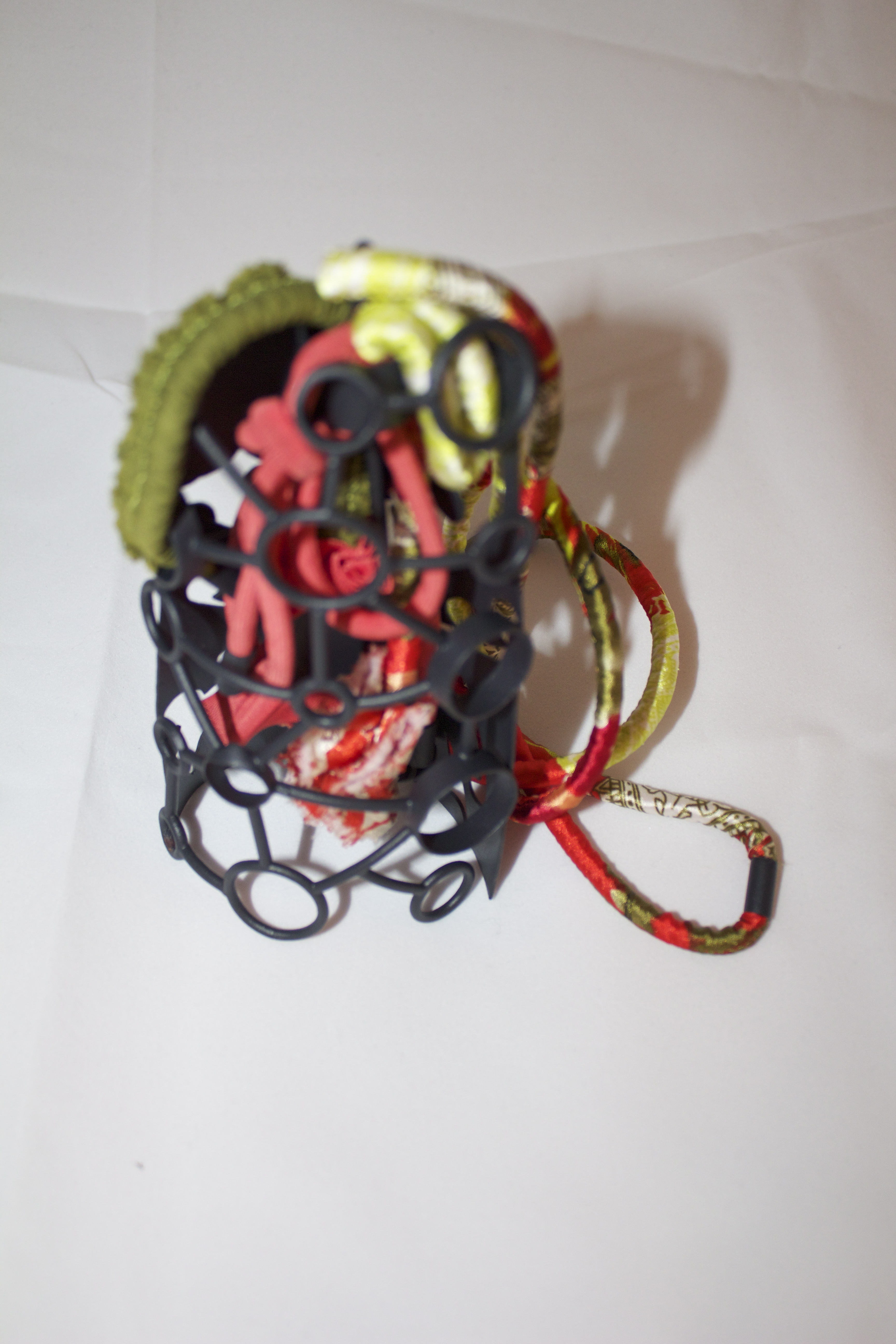 I did however have another go at this and found the second attempt much better. The piece below is made from rubber, textiles, and found objects.