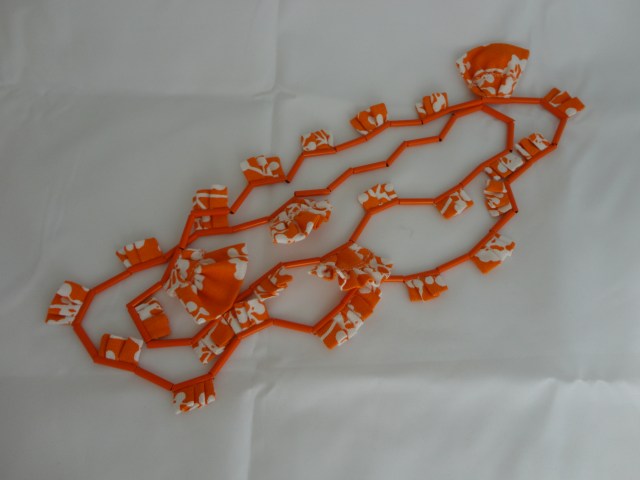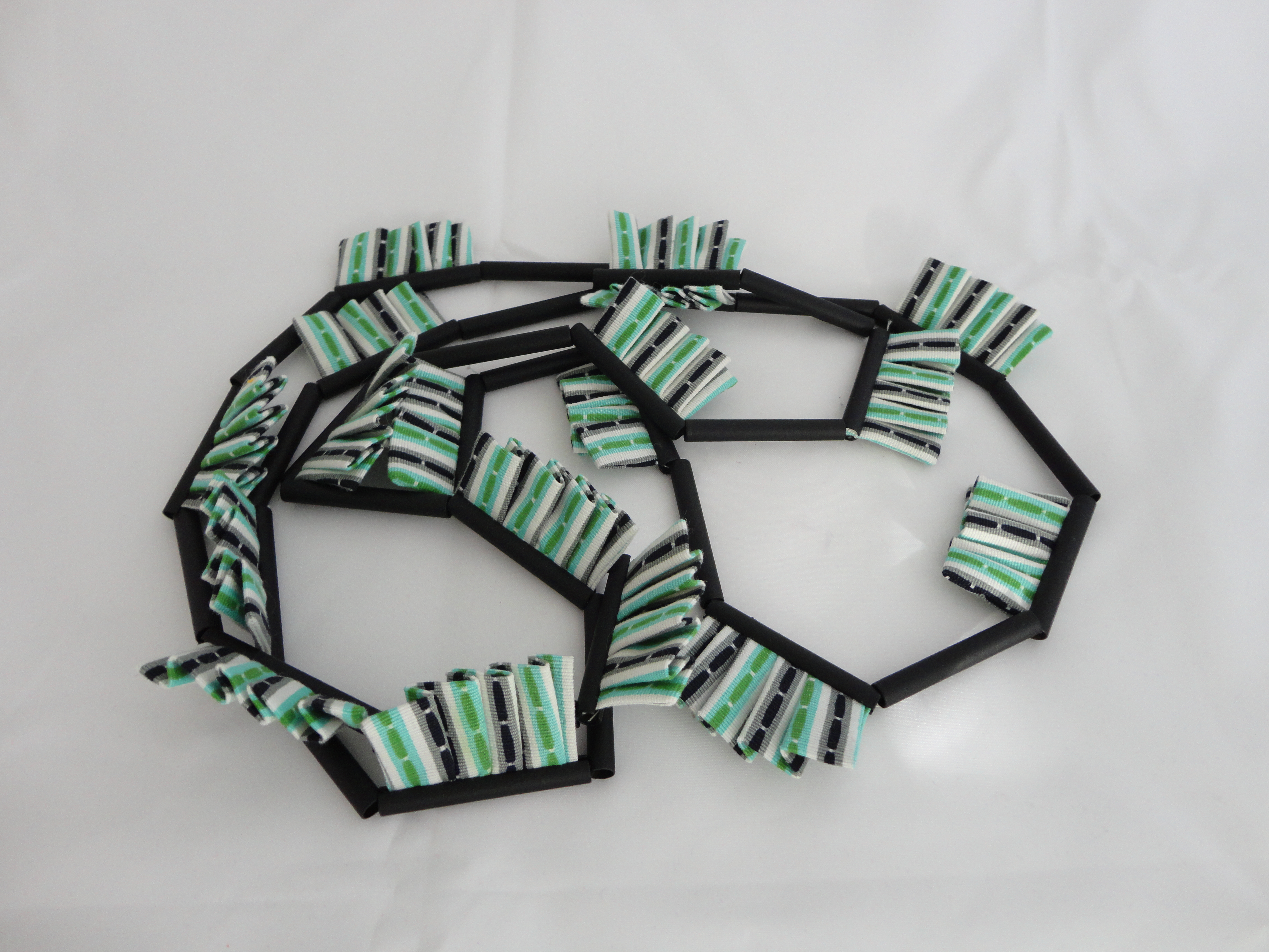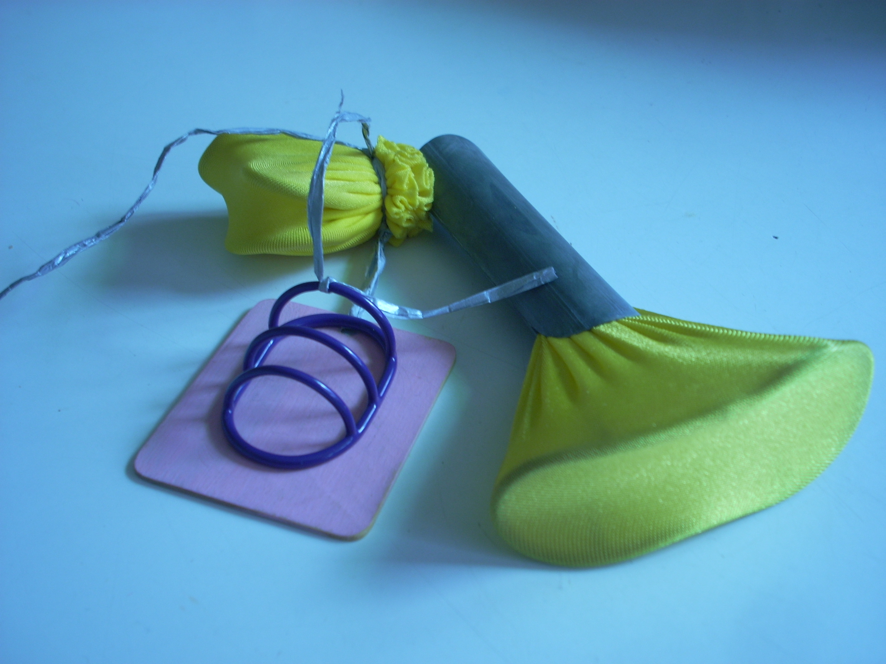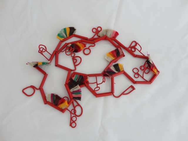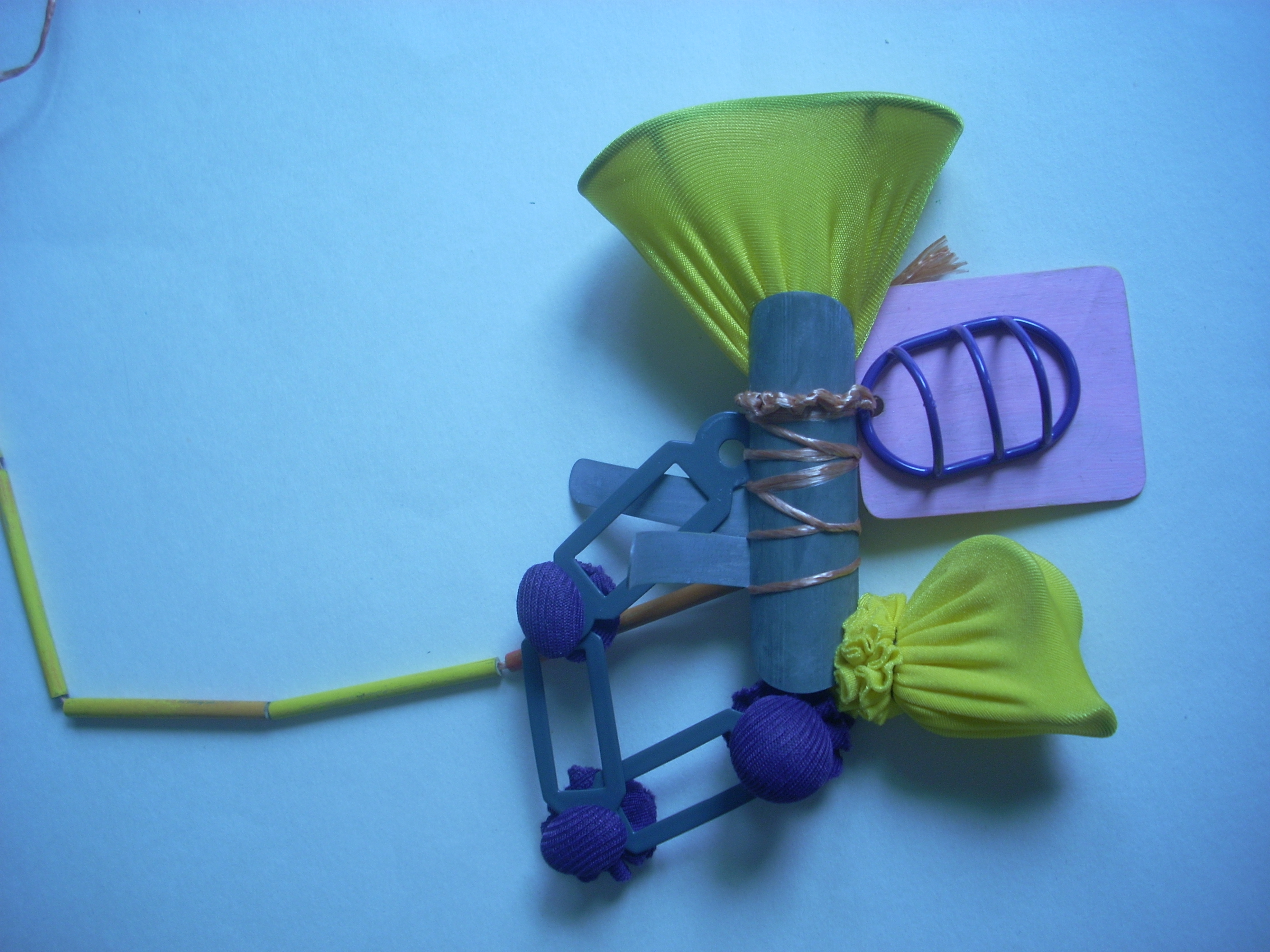 This is a photo of the joint piece between Lucy and myself. Lucy sent it back with the pink tag, and she squeezed the large yellow structure. I sent it of with the purple piece and three grey links with purple fabric through the holes.