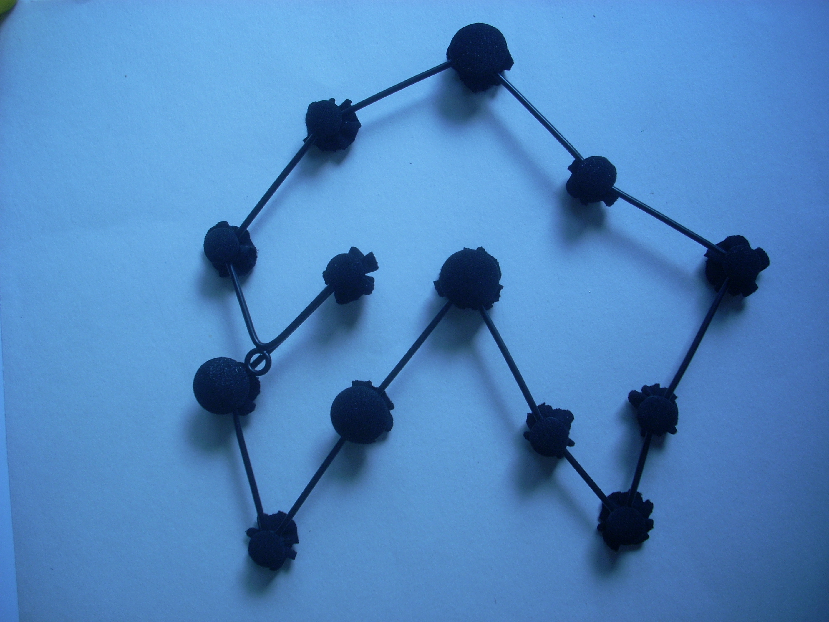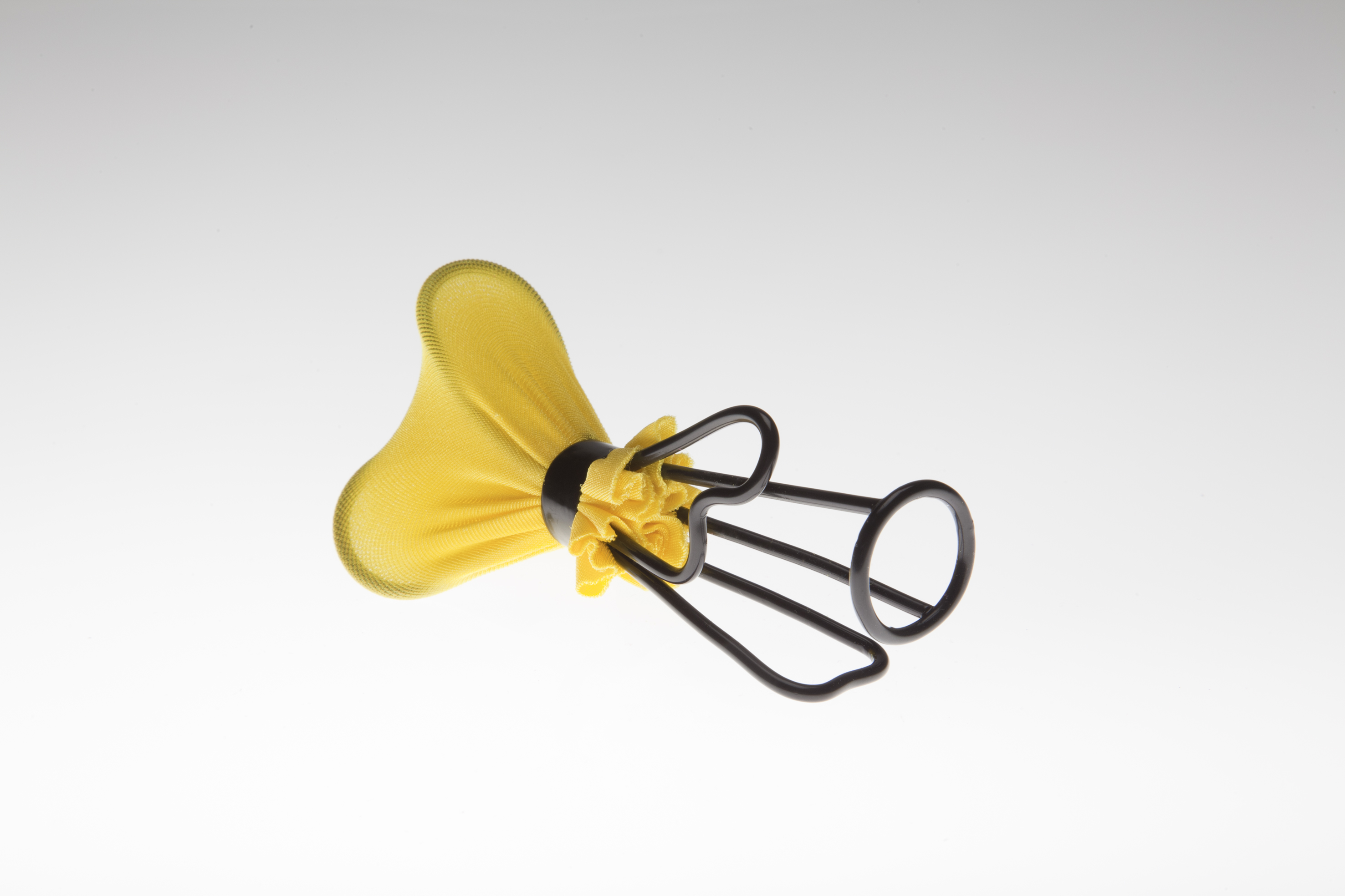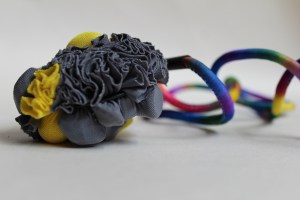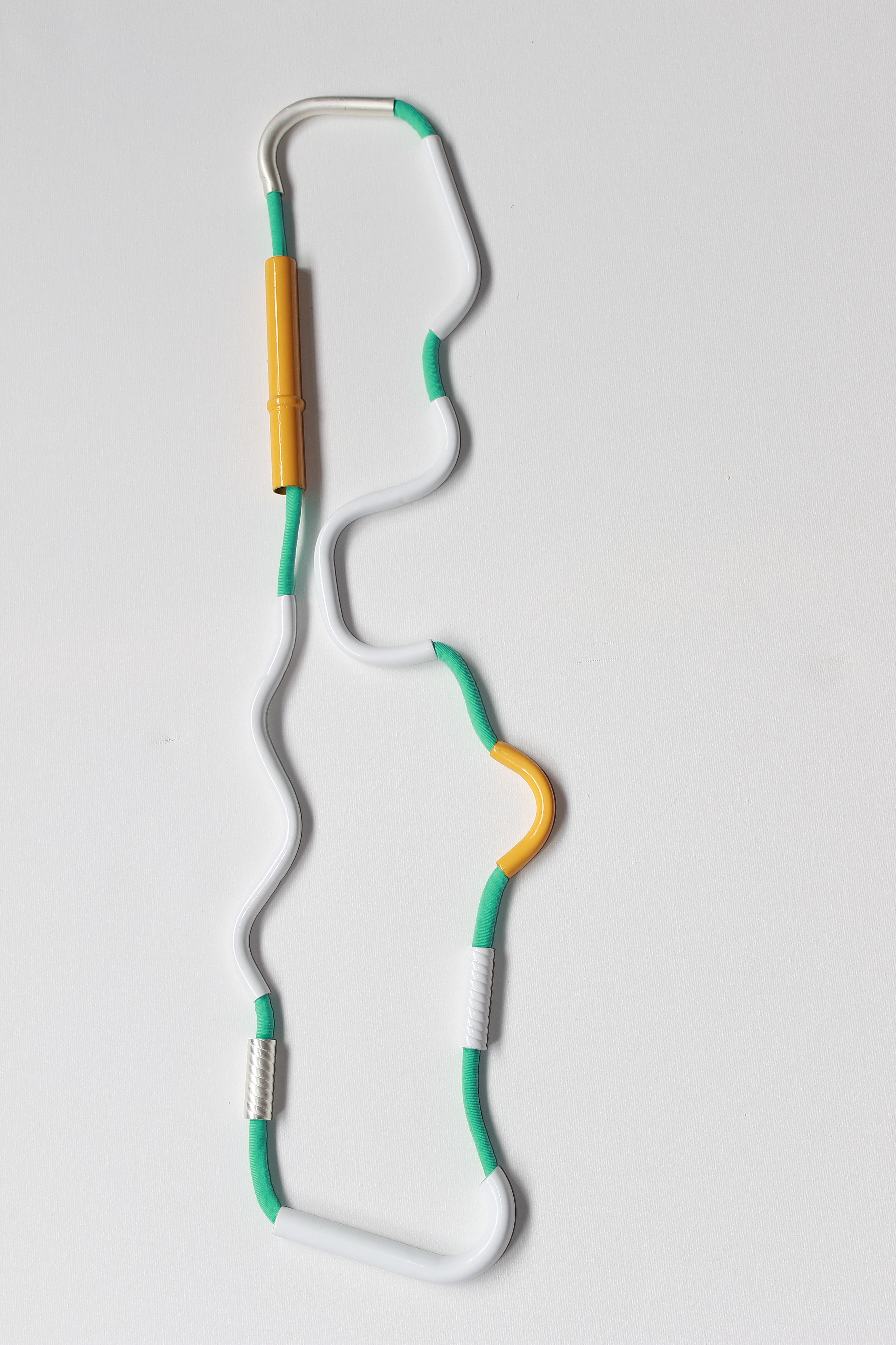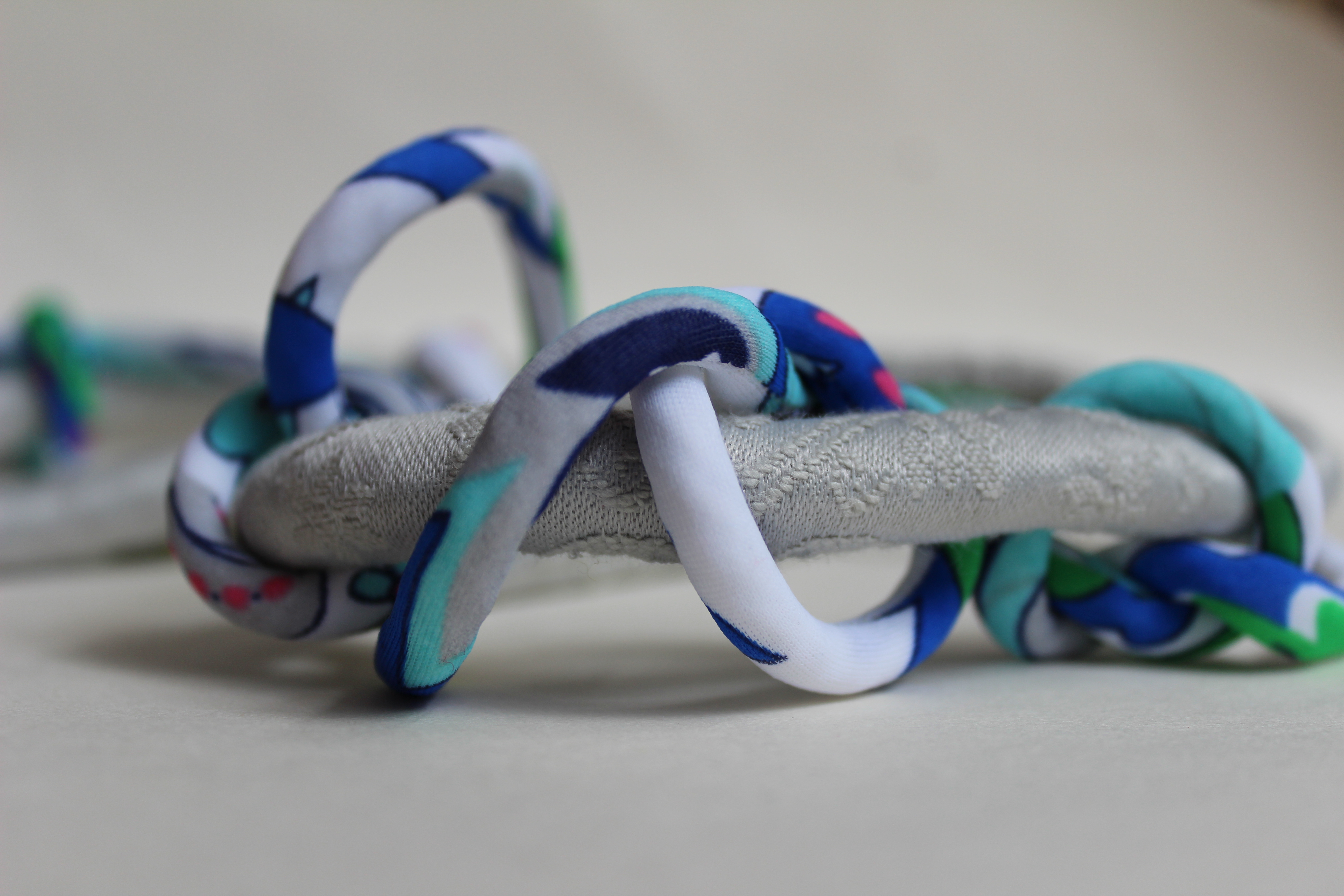 This is a photo of the joint piece between Lucy and myself. Lucy sent it back with the pink tag, and she squeezed the large yellow structure. I sent it of with the purple piece and three grey links with purple fabric through the holes.
