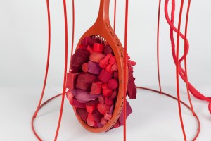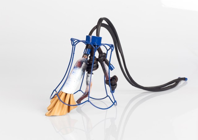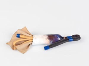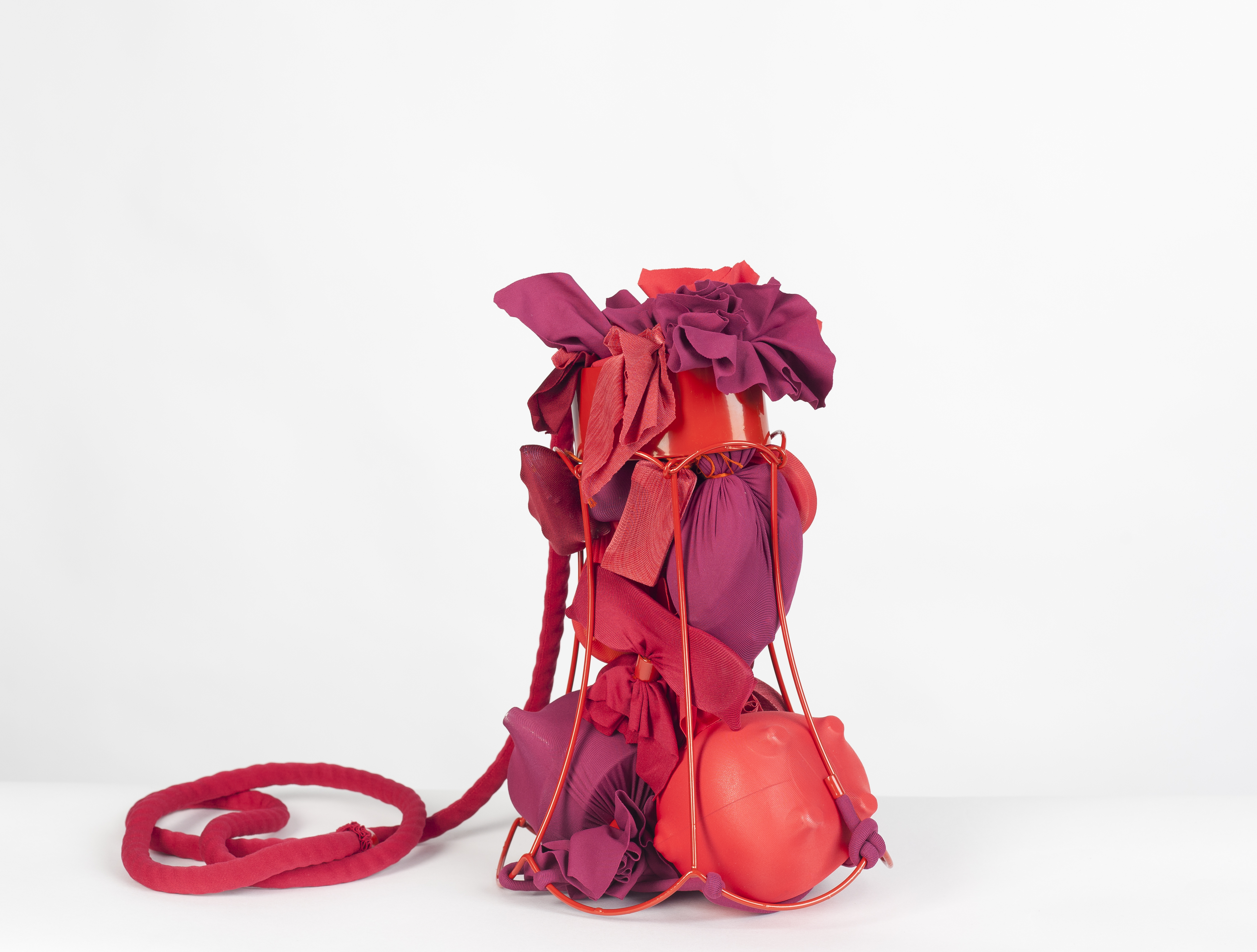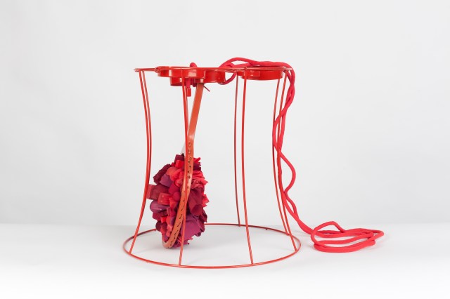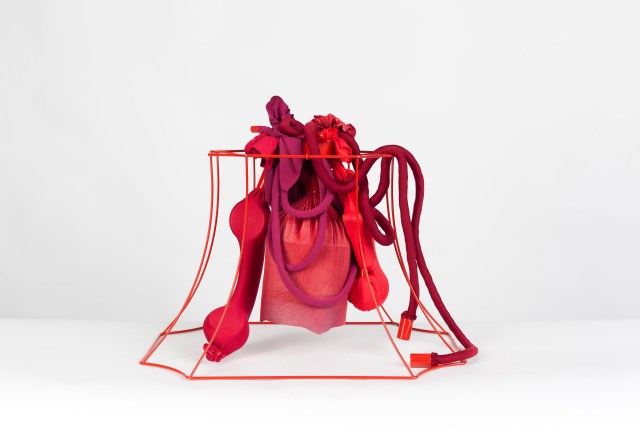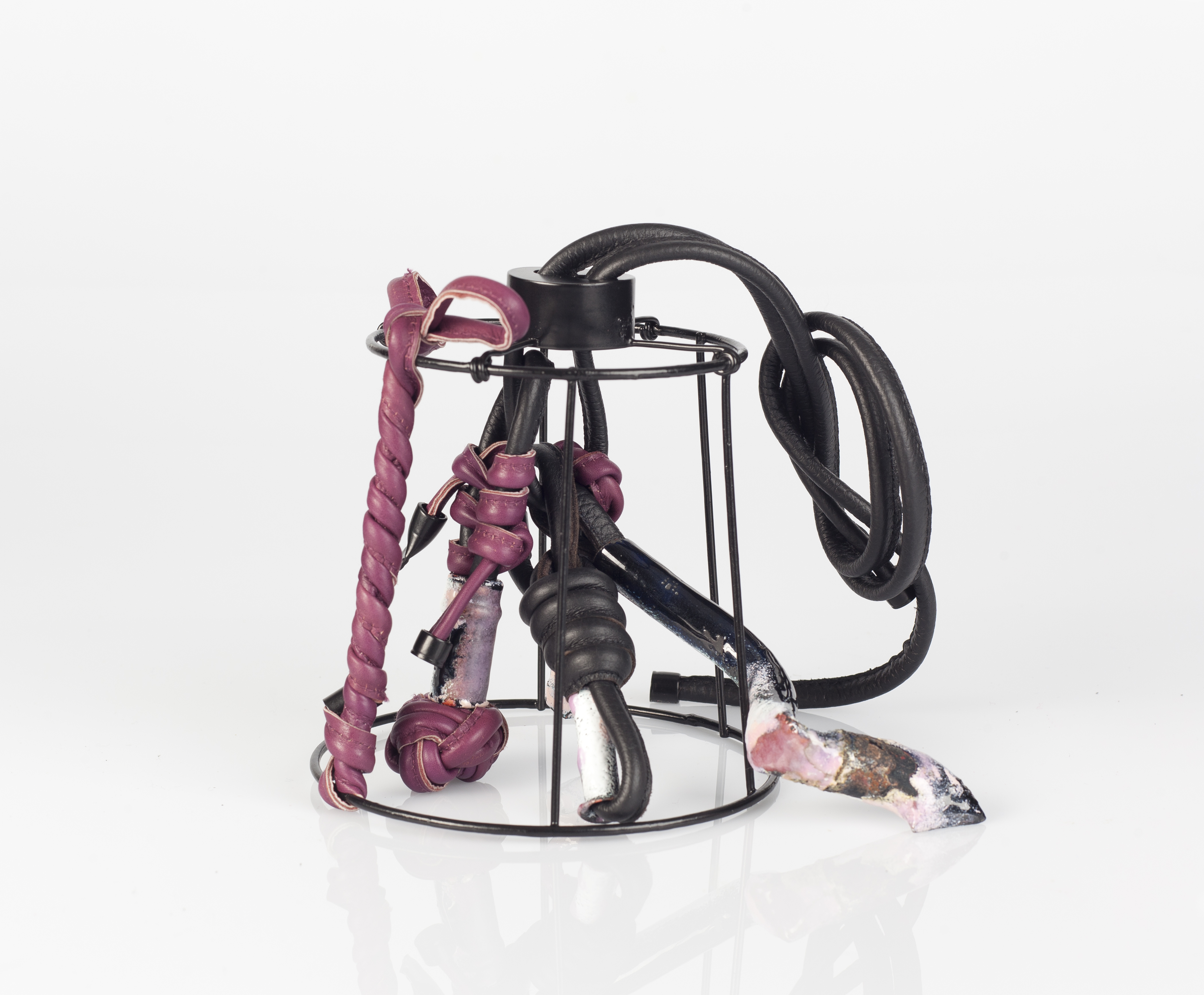 What happened was this unexpected painterly effect, the copper objects where taking on there own life. It reminded me of enamel work in the 60’s and 70’s. I liked the fact that it was resembling something of the past, it became familiar . With the structural object being the focus I decided to use leather as my fabric. It seemed right to use as it reflects a craft from a few decades ago- I’m just reinterpreting it.