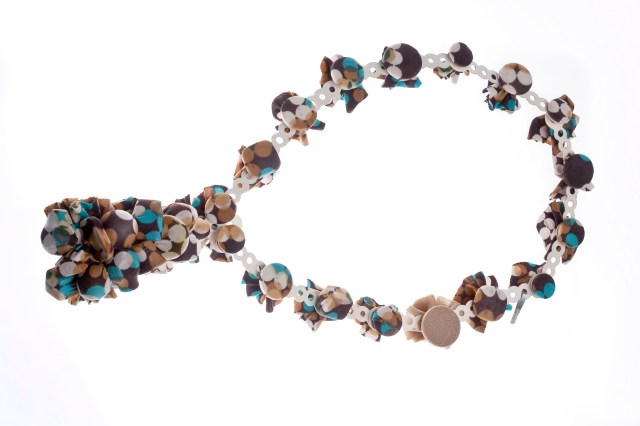In my work I am interested in two forms of adornment,- garment and jewellery. My curiosity lies in the crossover of the two and how close they come to each other, and what happens in the exchange. The metal gives a sense of traditional jewellery. Using it as framework for the underlying structure in which i push through fabric embedded with objects to add a sculptural dimension. Fabric embodies a piece of history, often a favorite garment has memories adding another layer. By recycling it into another form of simple beauty and detail allows a connection physically and emotionally to the wearer.