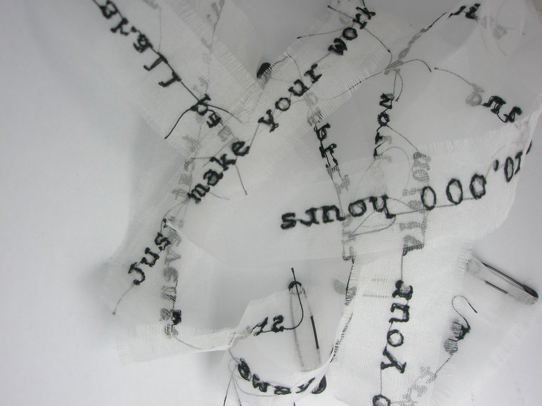 I visit my mother, who has had a bad reaction to some medication and is rendered vulnerable and afraid. Her shopping list breaks my heart (she was once a calligrapher, I remember her inscribing the names on high school award certificates). I have an enduring love of the printed word, the character of fonts, handwriting. I begin to embroider the list onto silk: