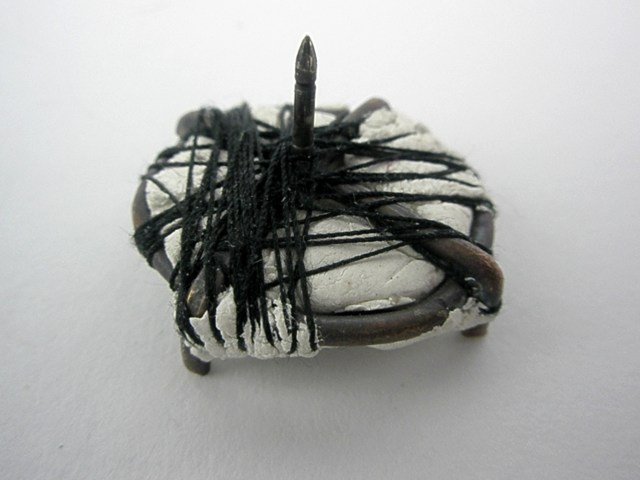The things we do to support the art habit/free us from having to make to sell. I am back in my suit, temporarily. Thinking of near-misses, the soldier’s life saved by the bible in his pocket. I make myself a staid little brooch:
